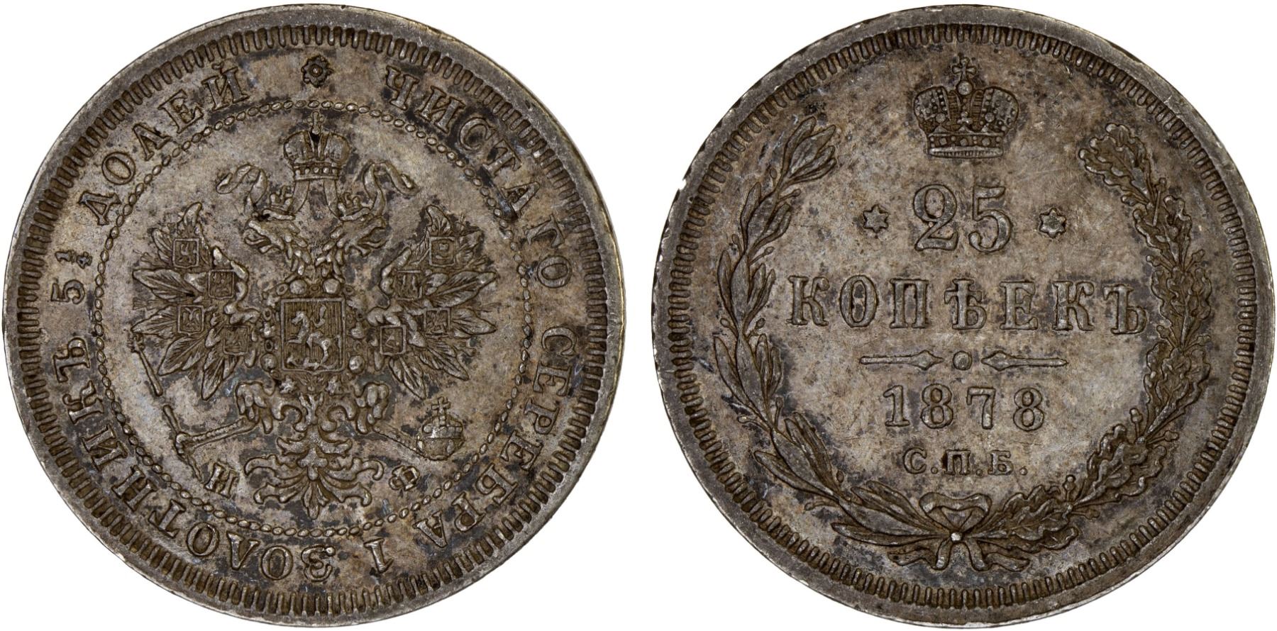 RUSSIA: Alexander II, 1855-1881, AR 25 kopeks, St. Petersburg, 1878, XF