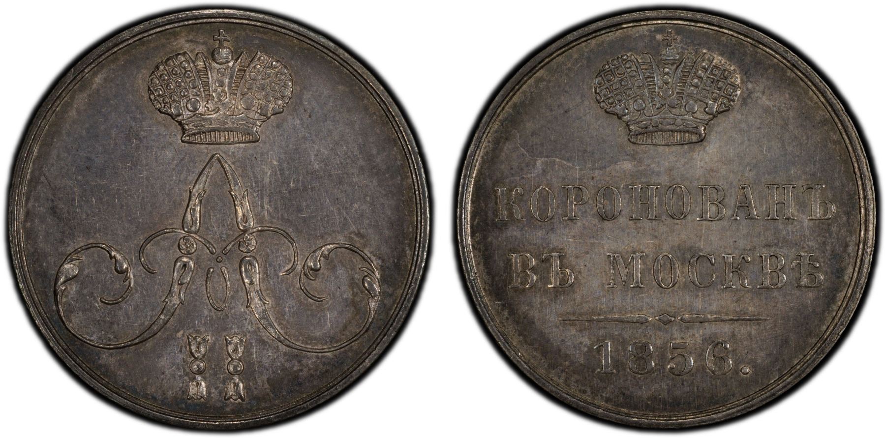 RUSSIA: Alexander II, 1855-1881, AR medal, 1856, Diakov-653.3, 22mm silver jeton, commemorating the Coronation of Alexander IIon August 26, 1856, a pleasant lustrous mint state example, PCGS graded MS61. The coronation of Alexander II as Tsar of Russia took place on September 7, 1856 (August 26, Old Style) in the Assumption Cathedral of the Moscow Kremlin. This event marked the beginning of his reign and was a grand display of Russian imperial tradition and ceremony.