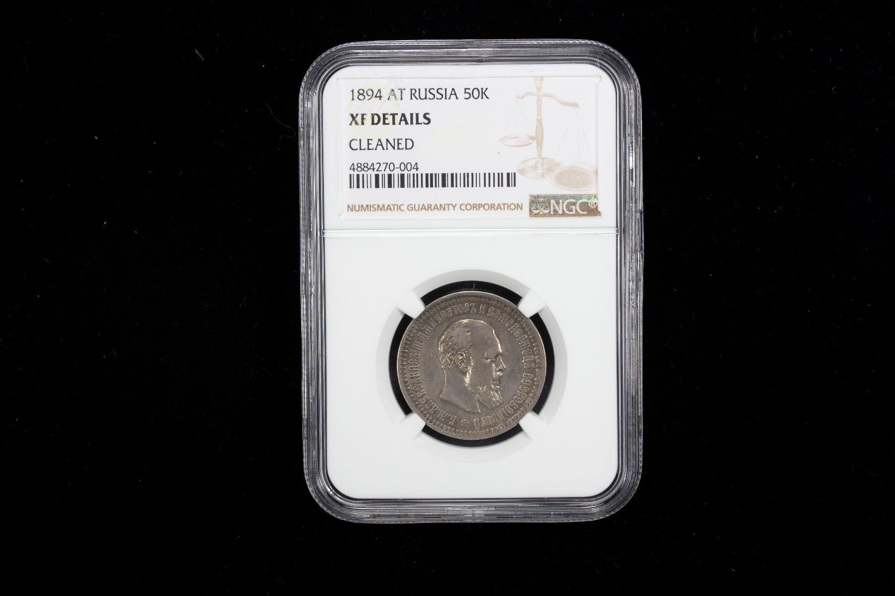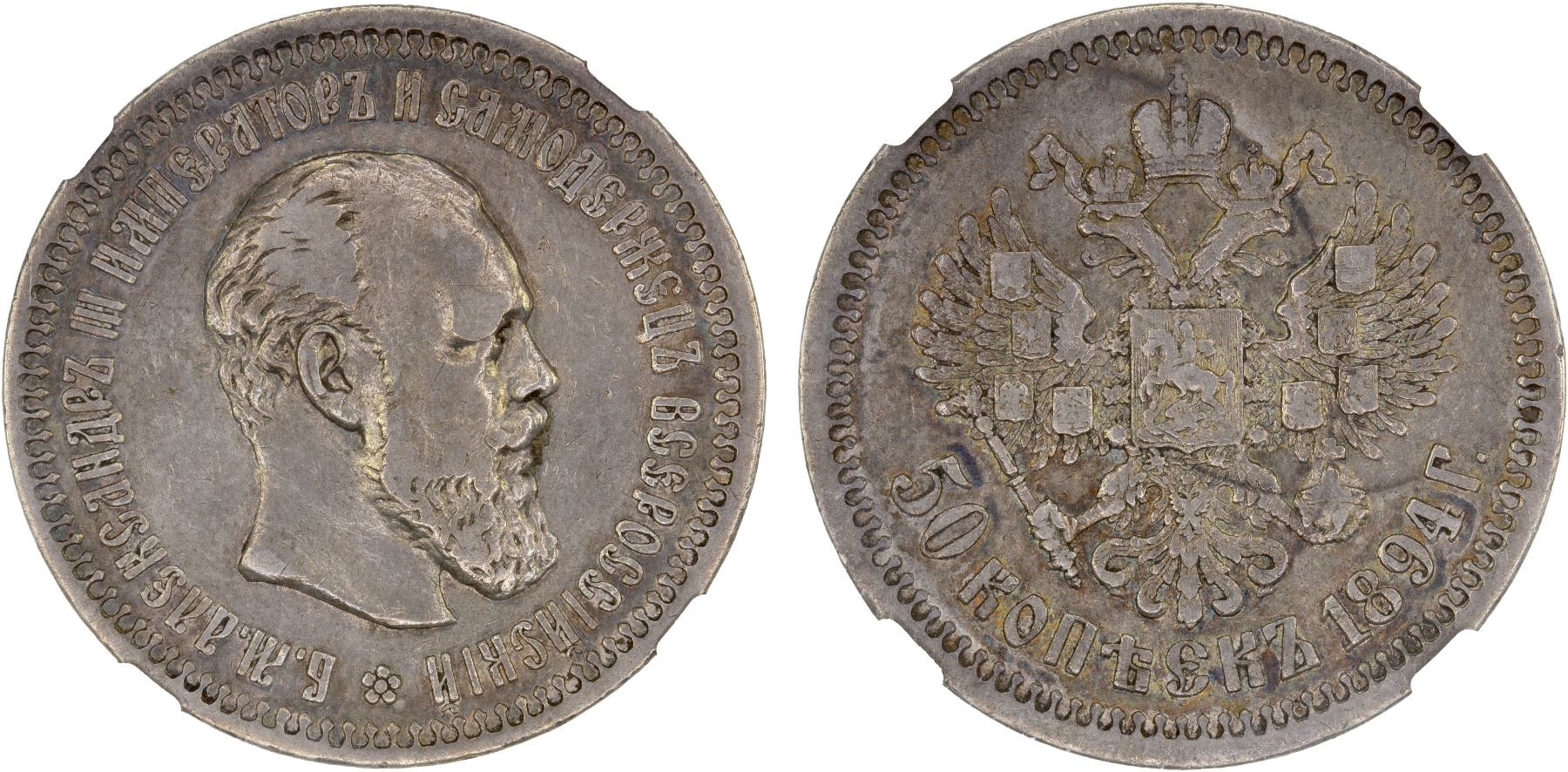 RUSSIA: Alexander III, 1881-1894, AR 50 kopeks, St. Petersburg, 1894, Y-45, lightly cleaned, light contact marks, lightly toned, NGC graded XF details, Heritage Auction 231929, Lot 63358.