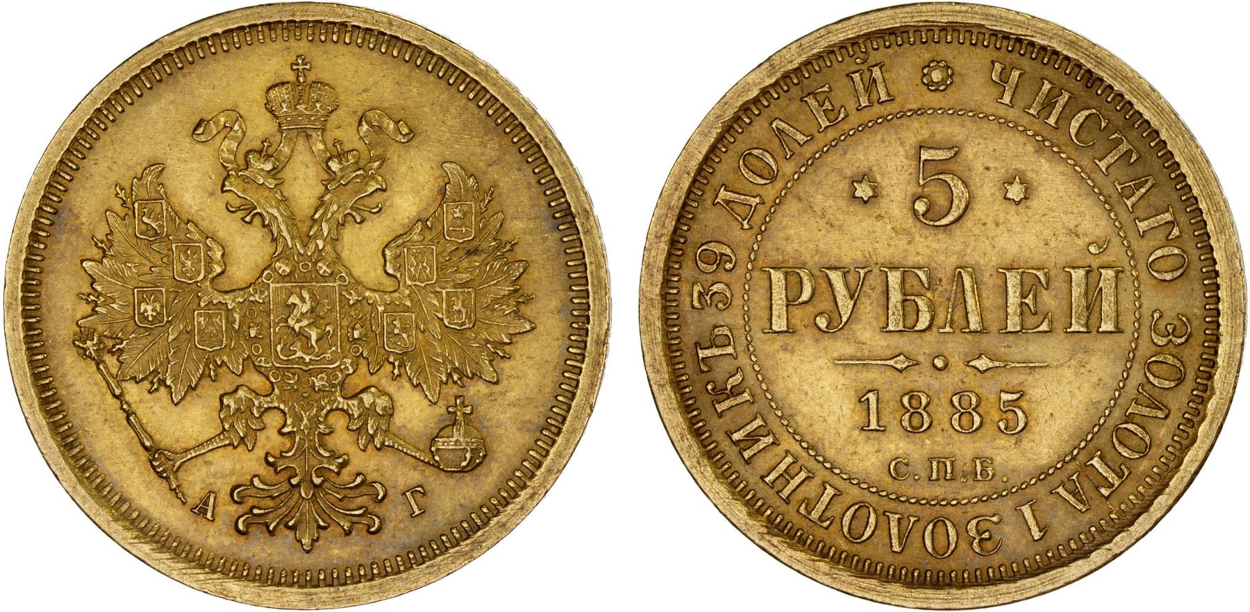 RUSSIA: Alexander III, 1881-1894, AV 5 roubles, 1885, Y-B26, XF.
