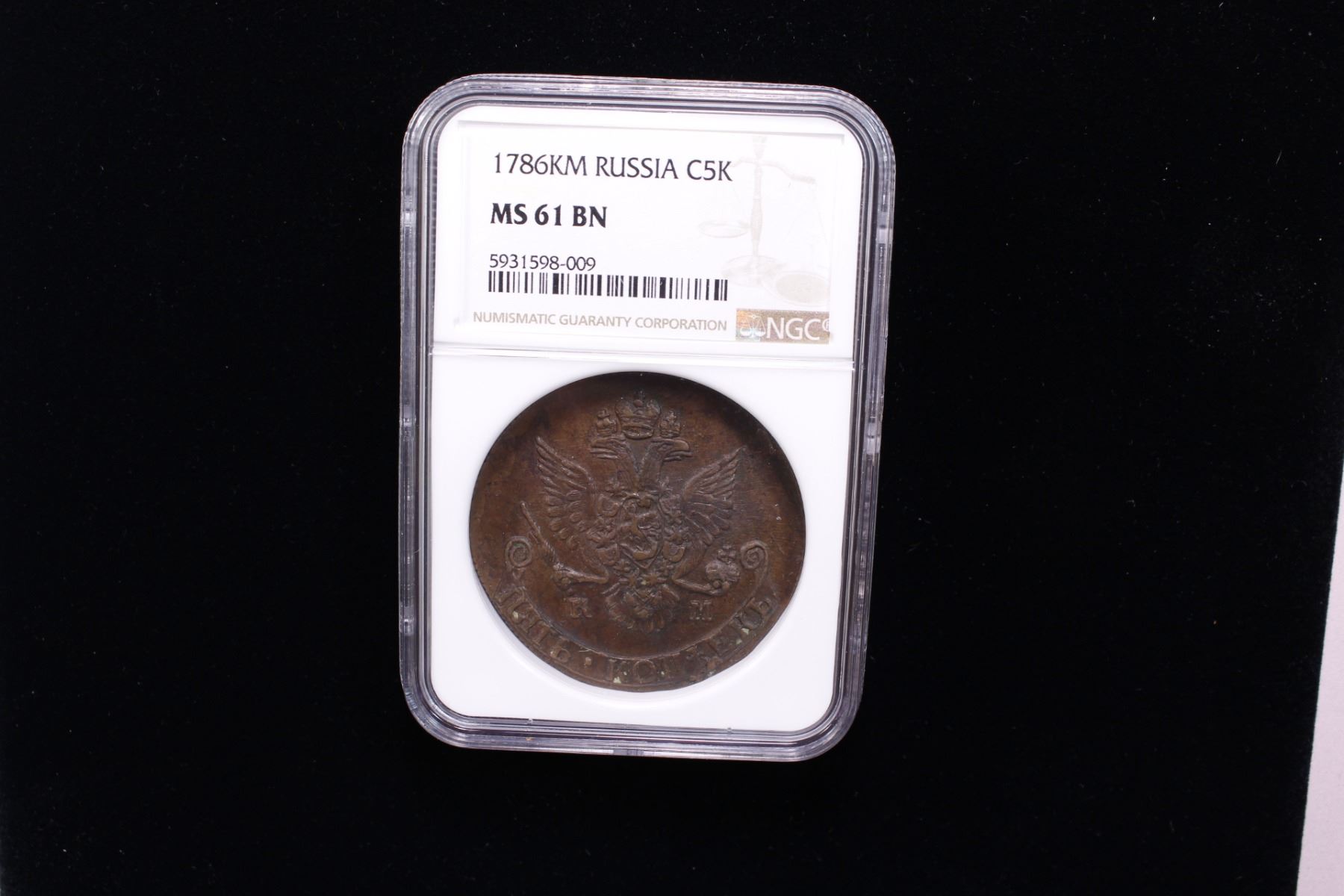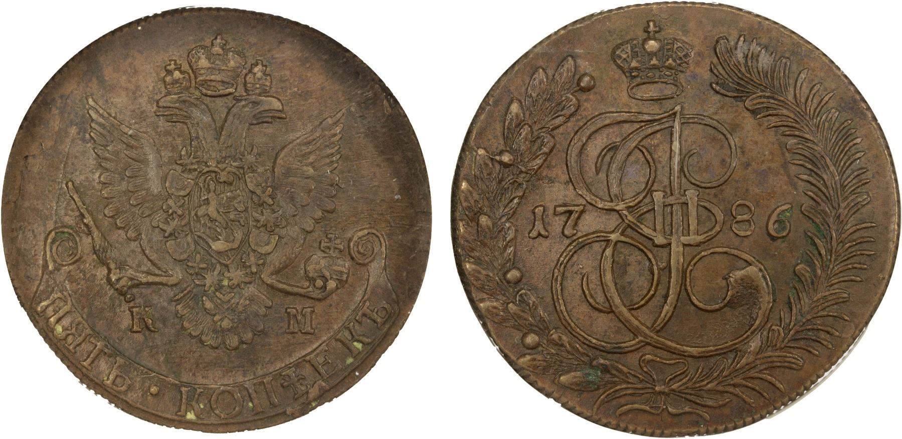 RUSSIA: Catherine II, 1762-1796, AE 5 kopecks, Suzun Mint, 1786-KM, Cr-59.5, Bitkin-791, lovely brown patina, NGC graded MS61 BN.