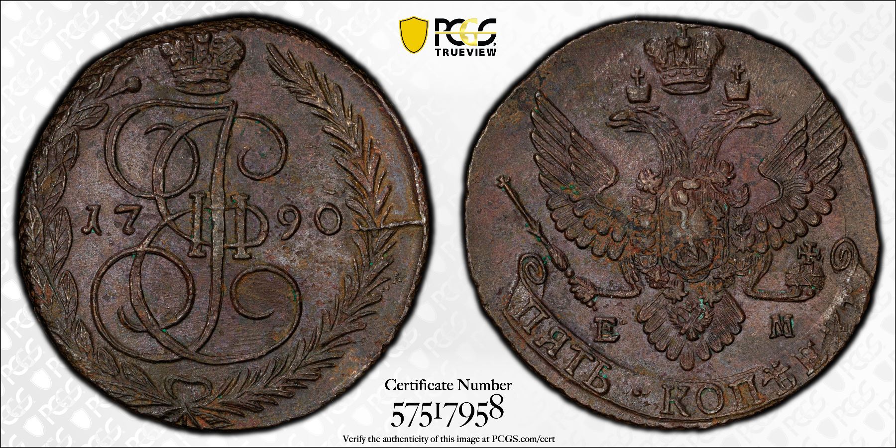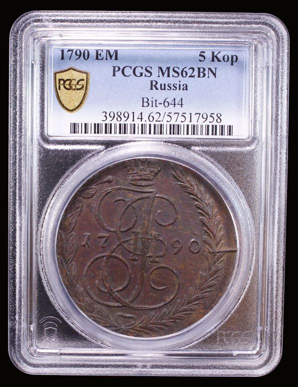 RUSSIA: Catherine II, 1762-1796, AE 5 kopeks, 1790-EM, PCGS MS62 BN