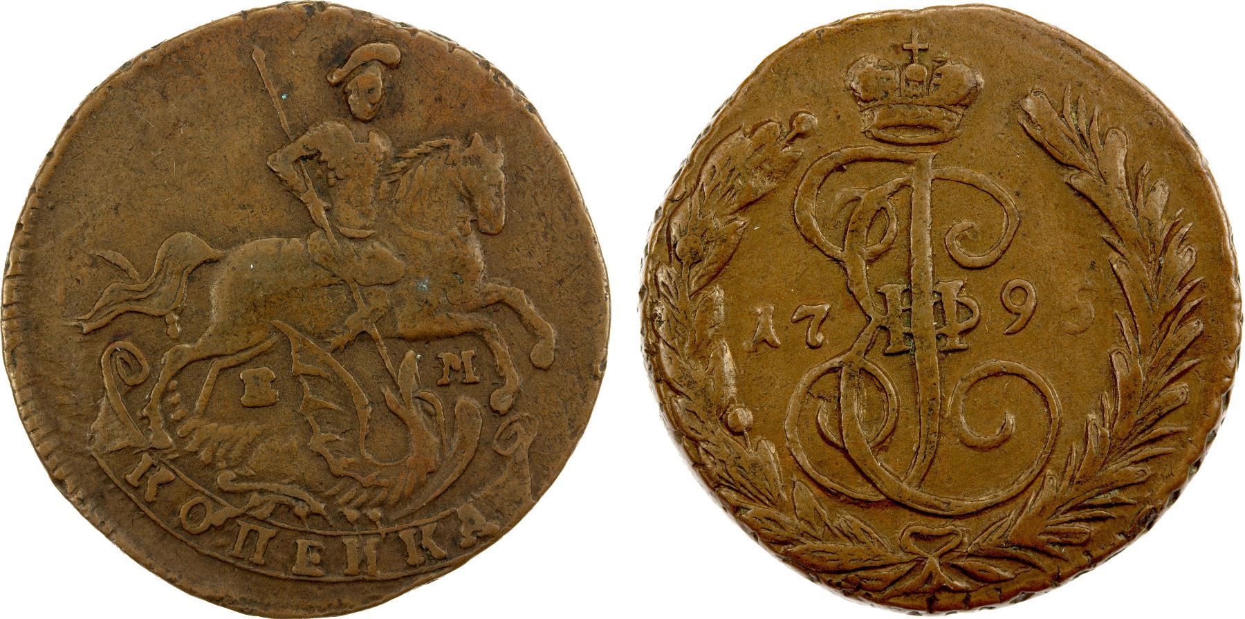 RUSSIA: Catherine II (The Great), 1762-1796, AE kopek, 1795-EM, Cr-57.2, die clash on reverse, VF-XF, ex Joe Sedillot Collection.