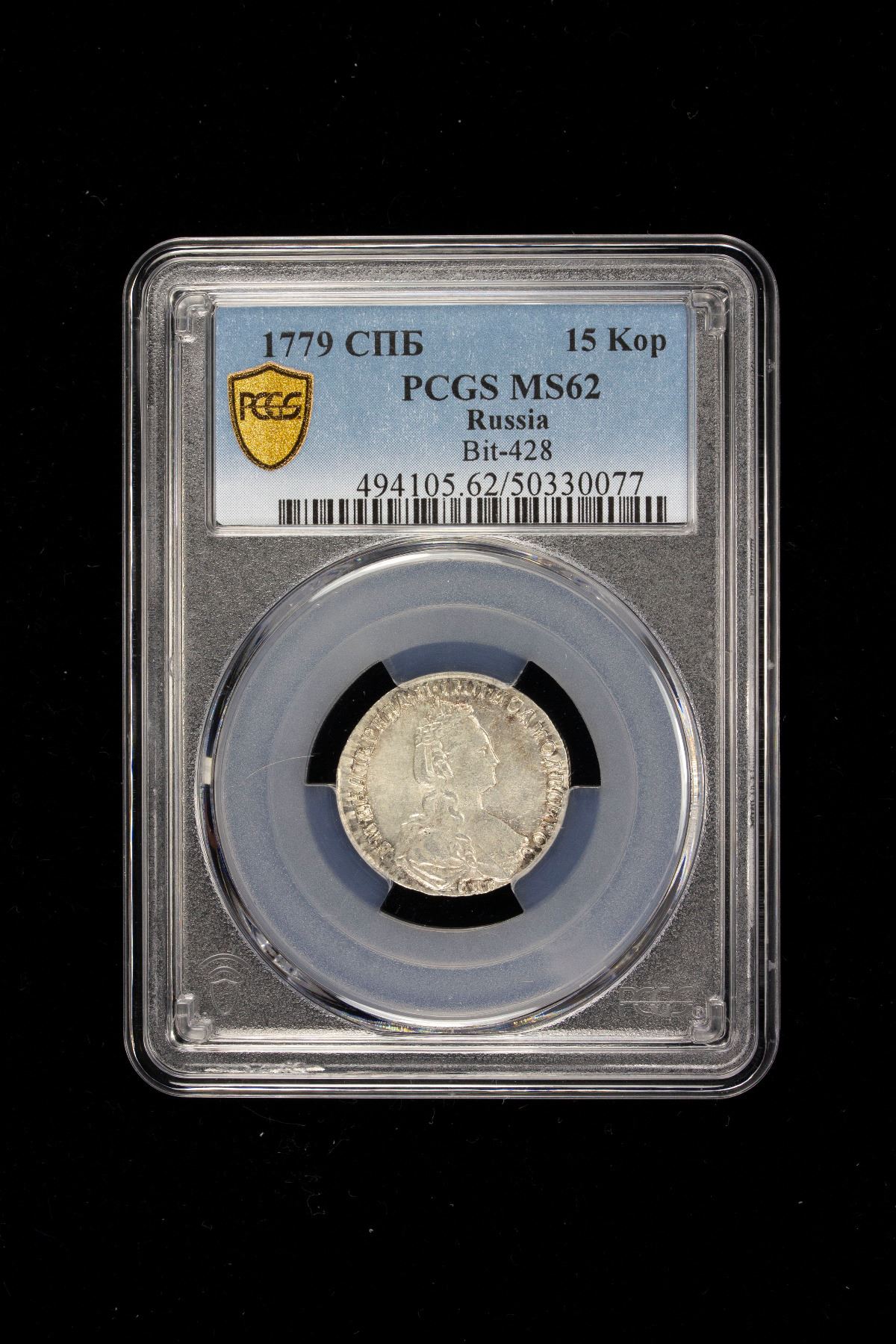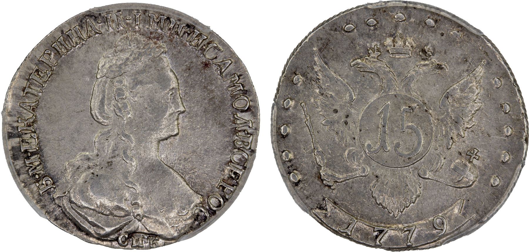 RUSSIA: EMPIRE: Catherine II, the Great, 1762-1796, AR 15 kopeks, 1779, Cr-62b, Bit-428, Saint Petersburg Mint, a pleasing lustrous mint state example, PCGS graded MS62, ex Dr. Robert A. Rosenfeld Collection.