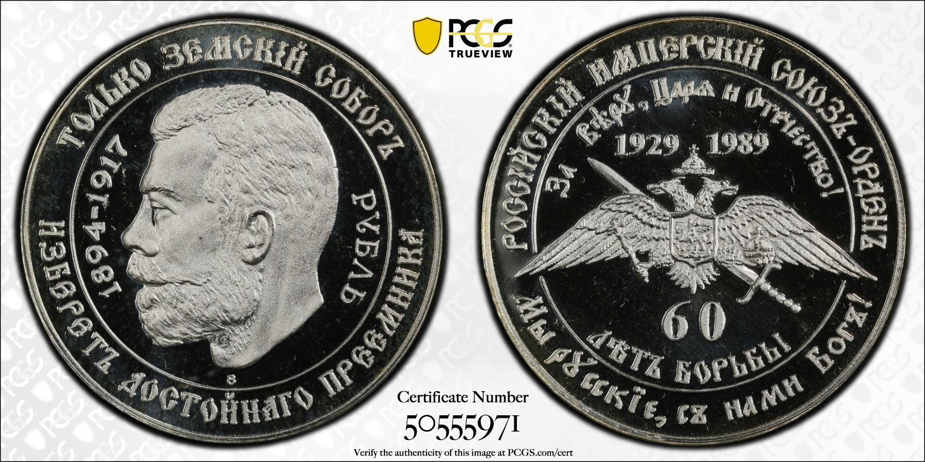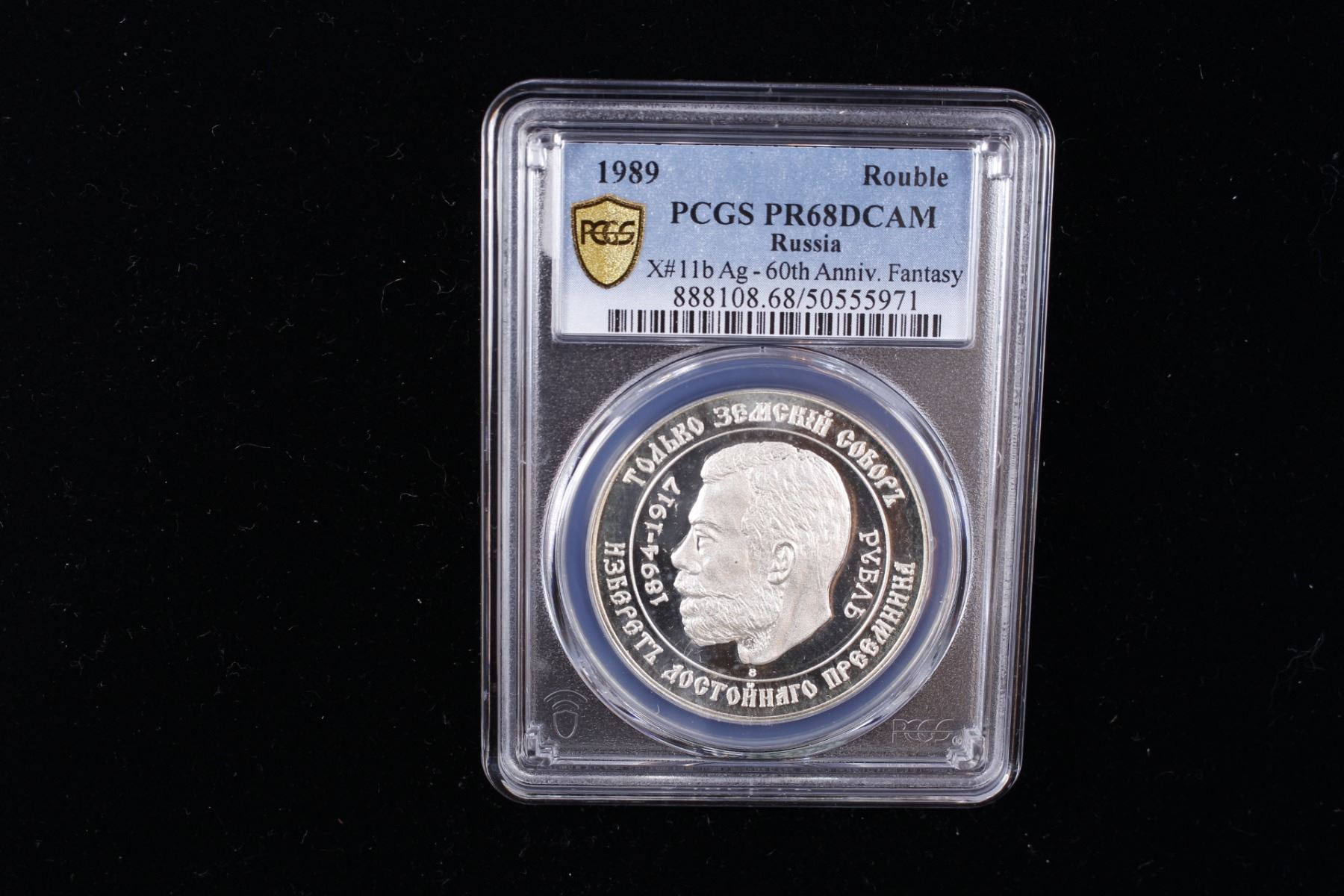 RUSSIA: Fantasy Issues, AR 10 dollars, 1989, KM-X15a, fantasy issue of Grand Duke Vladimir Kirillovich (1938-1992), struck in silver, head of Nicholas II left // double-headed eagle crowned with shield, sword behind, mintage of only 1,000 pieces, rare, PCGS graded Proof 68 DCAM. Fantasy type struck at the Maison de Frappe FDC, a private mint in Quebec, by Serge Huard. The Russian Imperial Union Order was founded in Paris in 1929 by a group of White Russian émigrés in order to promote the legitimate line of the Russian Czar and re-establish Russia as a monarchy.