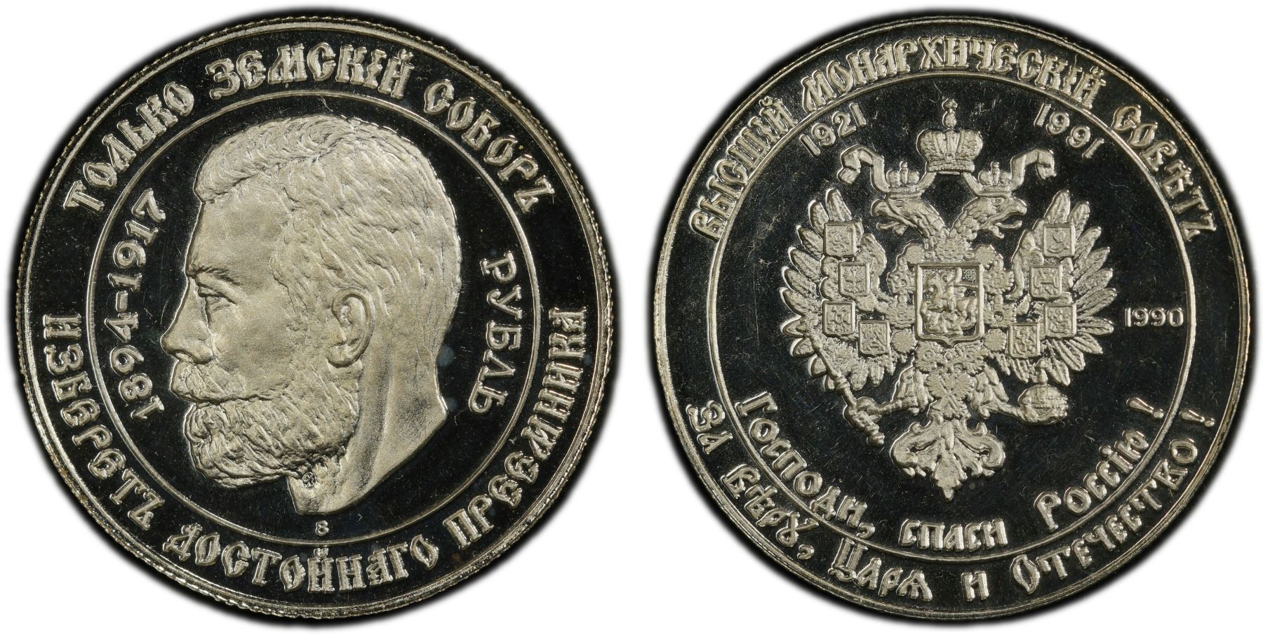 RUSSIA: Fantasy Issues, AR 10 dollars, 1989, KM-XP16, fantasy issue of Grand Duke Vladimir Kirillovich (1938-1992), piedfort (piéfort) struck in silver, head of Nicholas II left // double-headed eagle crowned with shield, sword behind, mintage of only 60 pieces, very rare, PCGS graded Proof 68 DCAM. Fantasy type struck at the Maison de Frappe FDC, a private mint in Quebec, by Serge Huard. The Russian Imperial Union Order was founded in Paris in 1929 by a group of White Russian émigrés in order to promote the legitimate line of the Russian Czar and re-establish Russia as a monarchy.