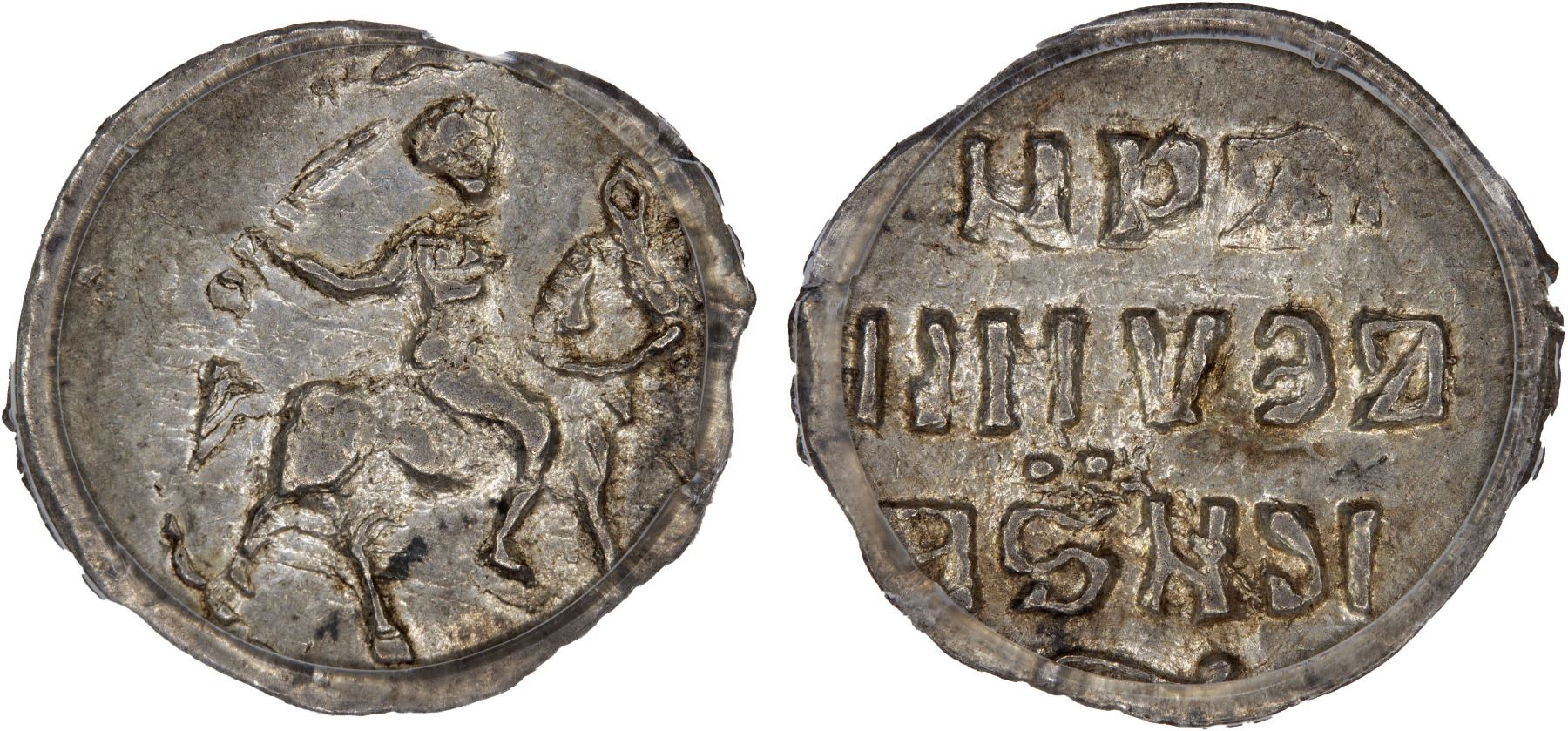 RUSSIA: Ivan IV 'the Terrible', 1547-1584, AR denga, HP-8272B, Tver mint, horseman riding right, brandishing sword // KNSb / BELÏKI / IBAN ("Grand Prince Ivan"), brilliant luster, PCGS graded MS62.