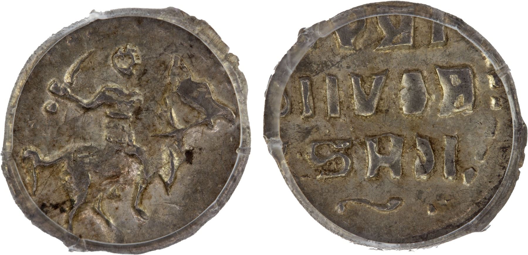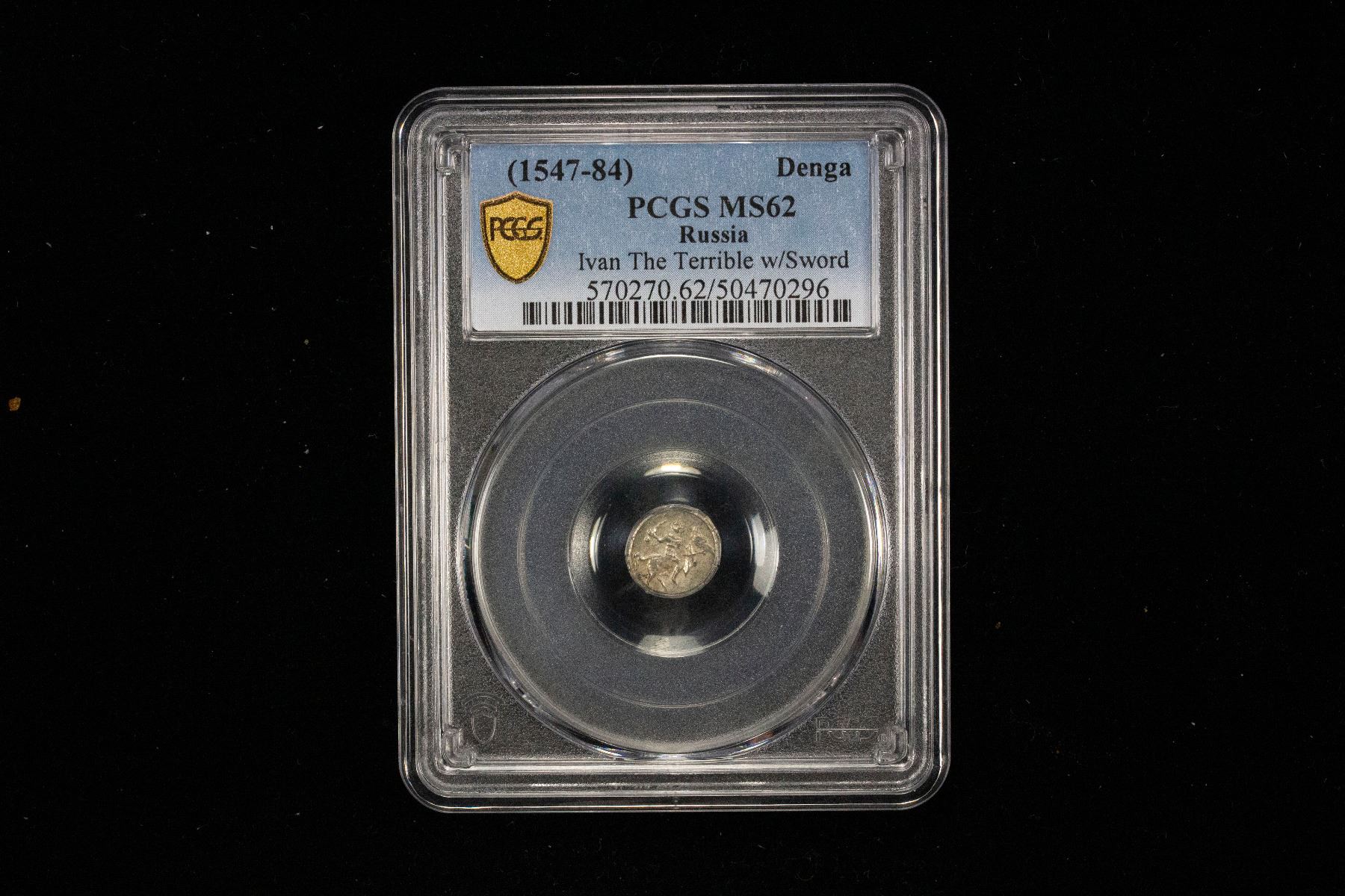 RUSSIA: Ivan IV 'the Terrible', 1547-1584, AR denga, HP-8262A, Moscow Mint, horseman riding right, brandishing sword // KNSb / BELIKI / IBAN ("Grand Prince Ivan"), toned light luster, PCGS graded MS62.