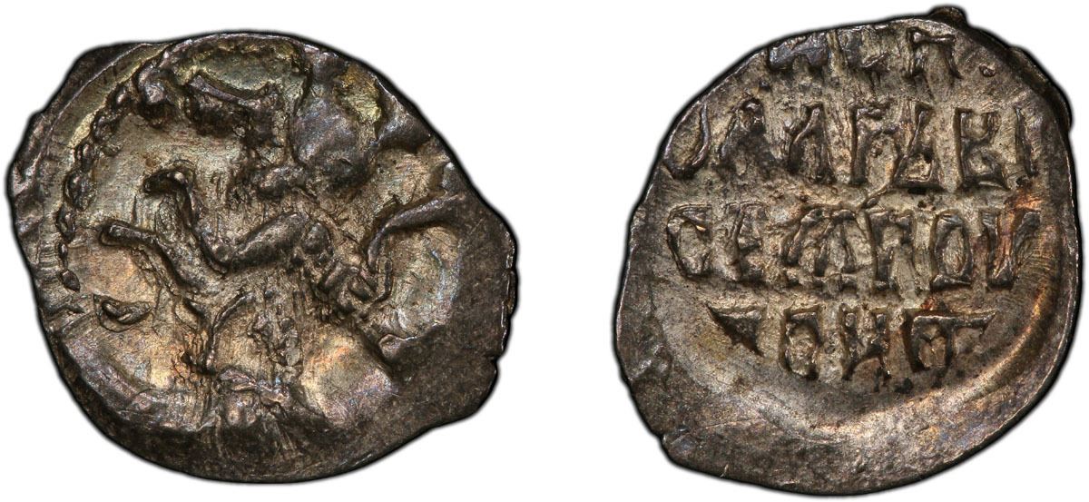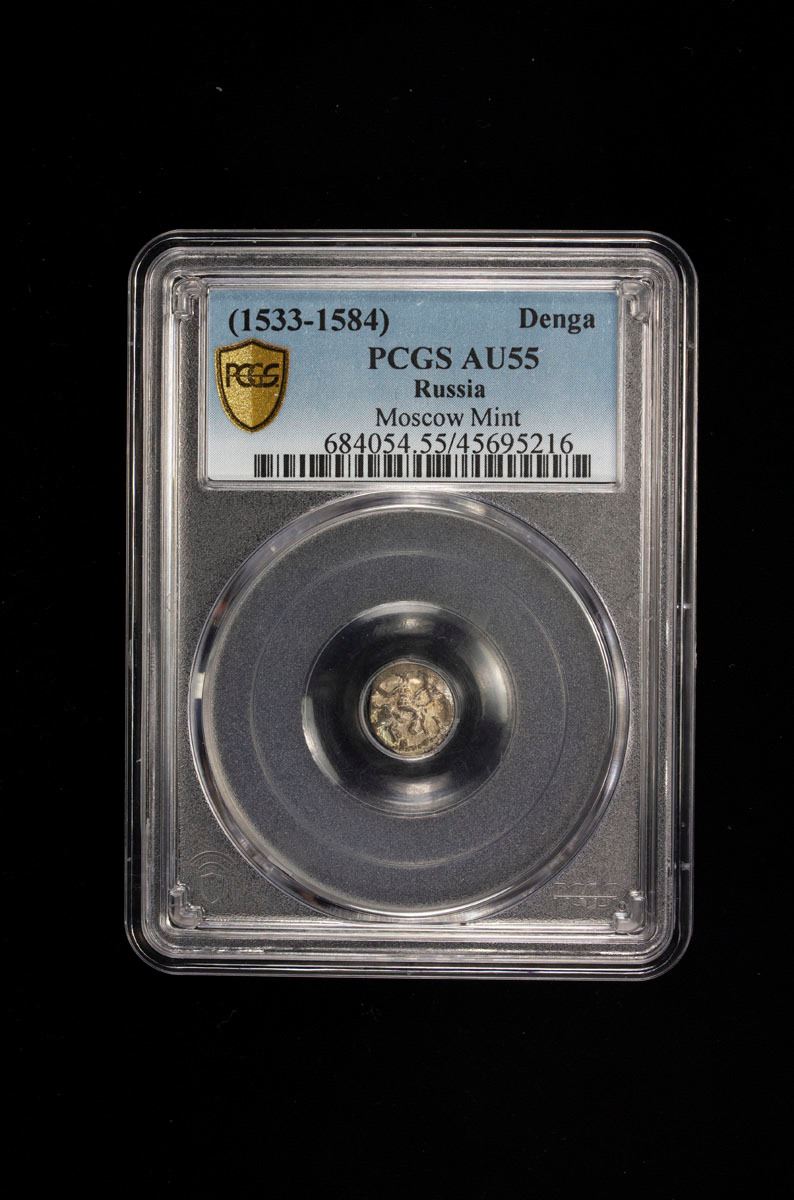 RUSSIA: MOSCOW: Ivan IV, the Terrible, 1533-1547, AR denga, Tver, KG-65, Orech-691, Chaudoir-215, horseman brandishing saber on galloping horse to right, an attractive lustrous example of this scarce reverse legend type, PCGS graded AU55. Ivan IV Vasilyevich, commonly known in English as Ivan the Terrible, was the grand prince of Moscow from 1533 to 1547 and the first Tsar of all Russia from 1547 to 1584. The mint is listed incorrectly as Moscow on the holder.