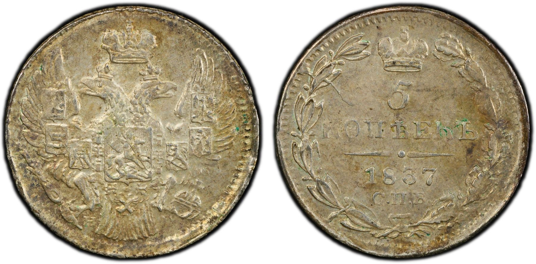 RUSSIA: Nicholas I, 1825-1855, AR 5 kopeks, 1837, Cr-163, St. Petersburg Mint, Nikolay Grachev mintmaster, a lovely example, PCGS graded MS63.