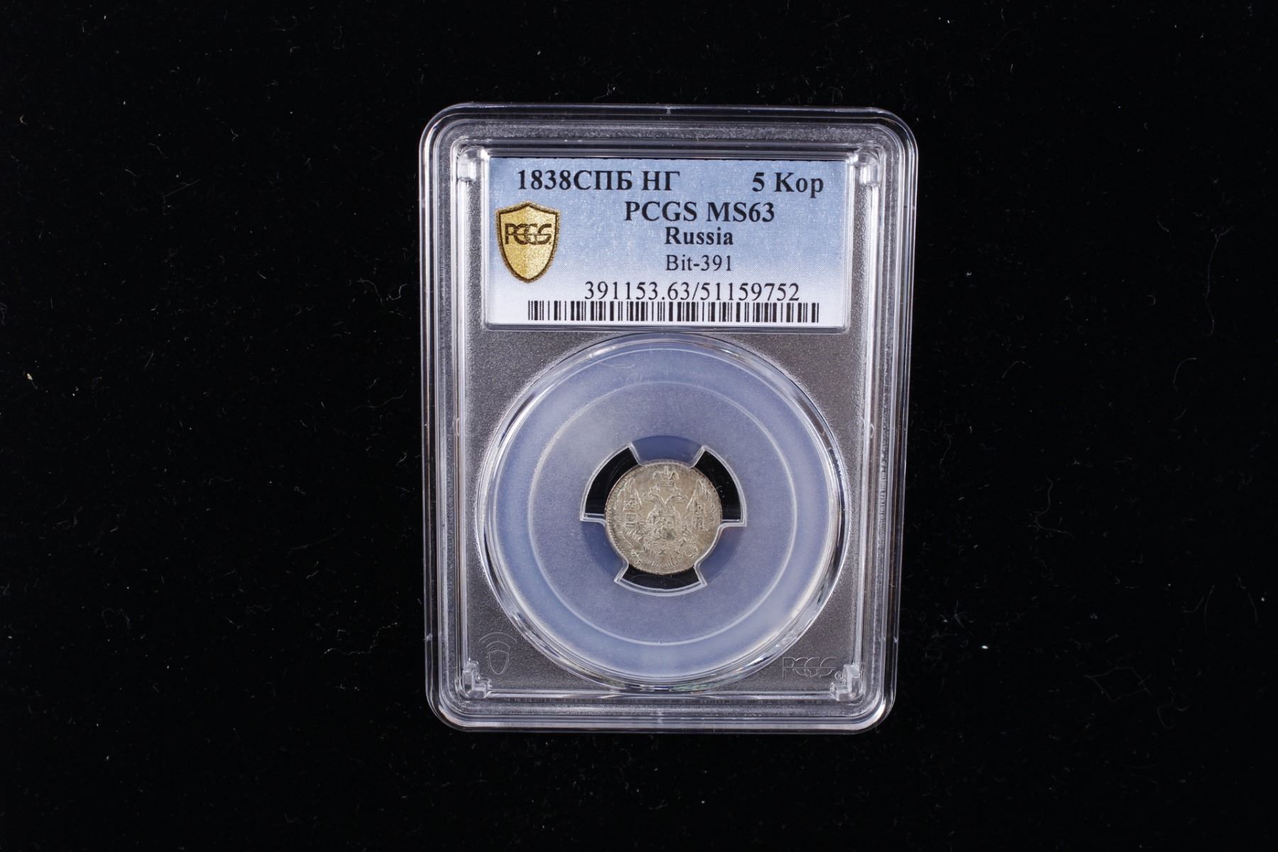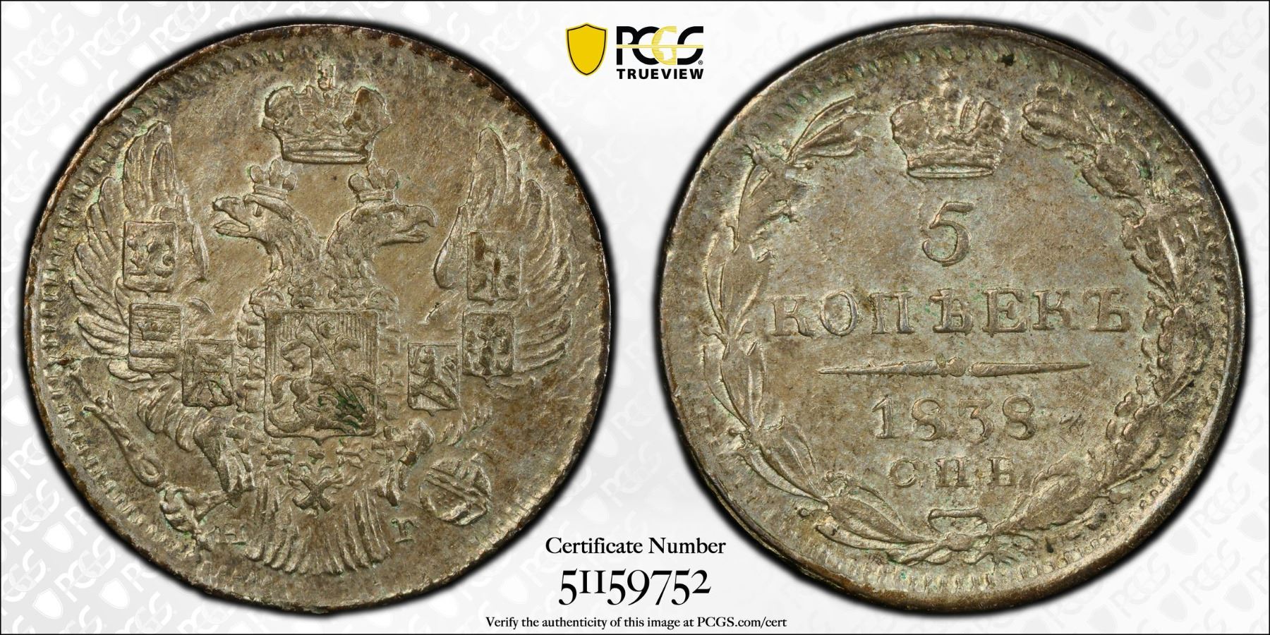 RUSSIA: Nicholas I, 1825-1855, AR 5 kopeks, 1838, Cr-163, St. Petersburg Mint, Nikolay Grachev mintmaster, a lovely example, PCGS graded MS63.