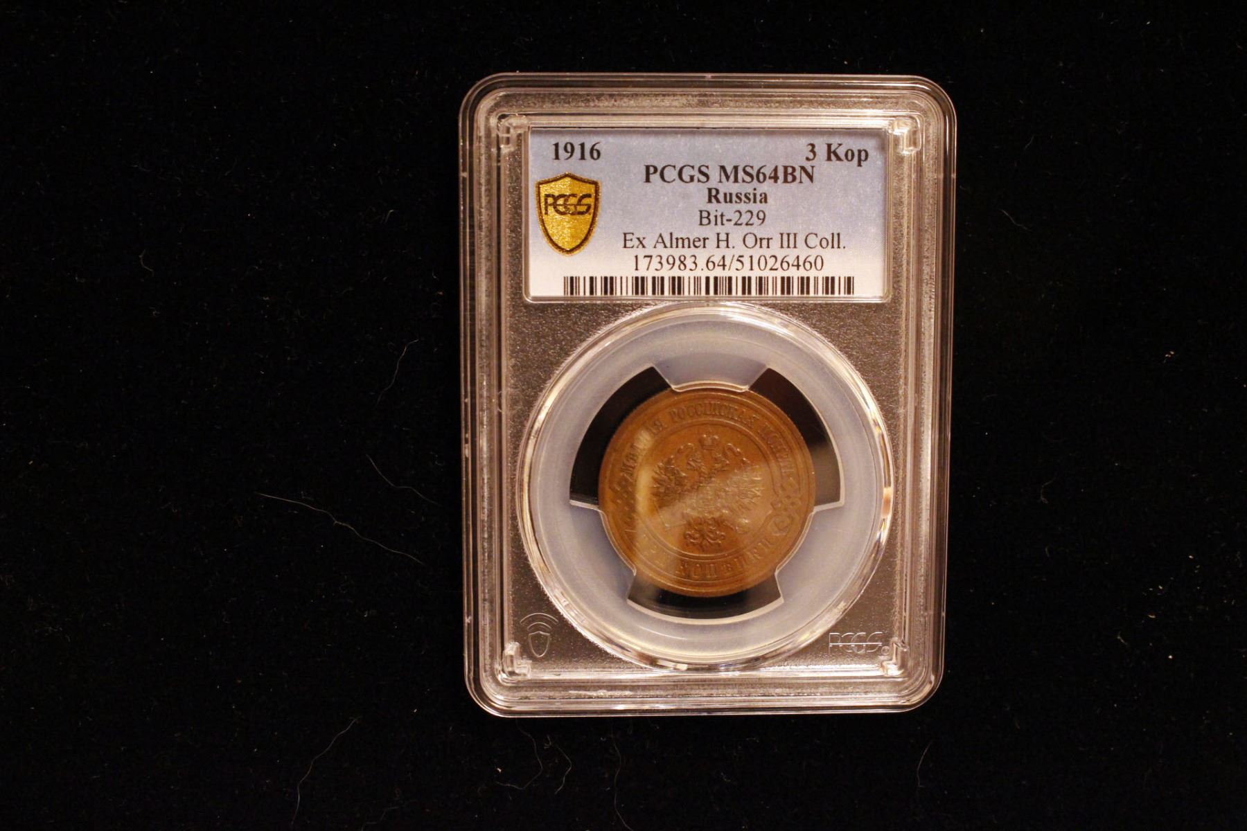 RUSSIA: Nicholas II, 1894-1917, AE 3 kopecks, 1916, Y-11.3, Bit-229, Petrograd mint, a wonderful quality example! PCGS graded MS64 BN, ex Almer H. Orr III Collection.