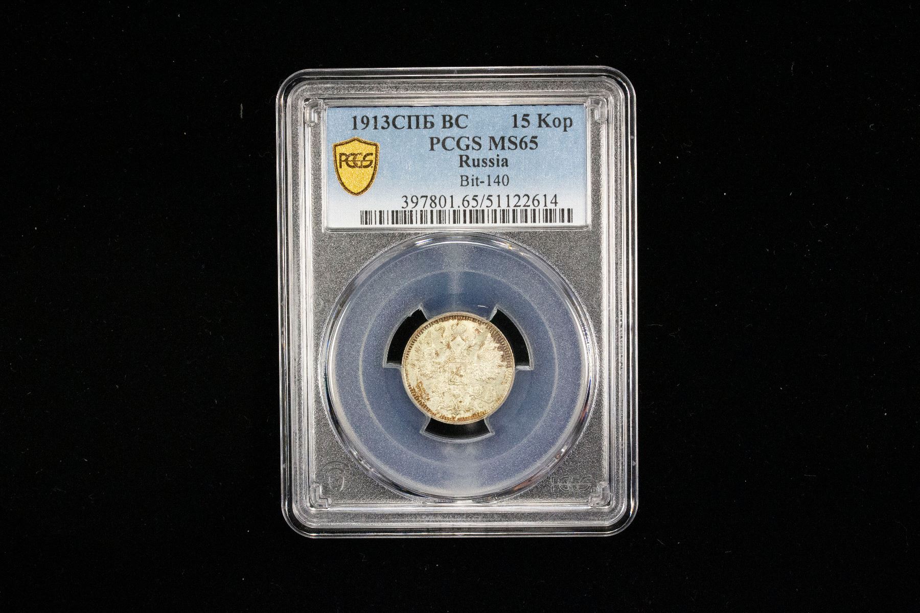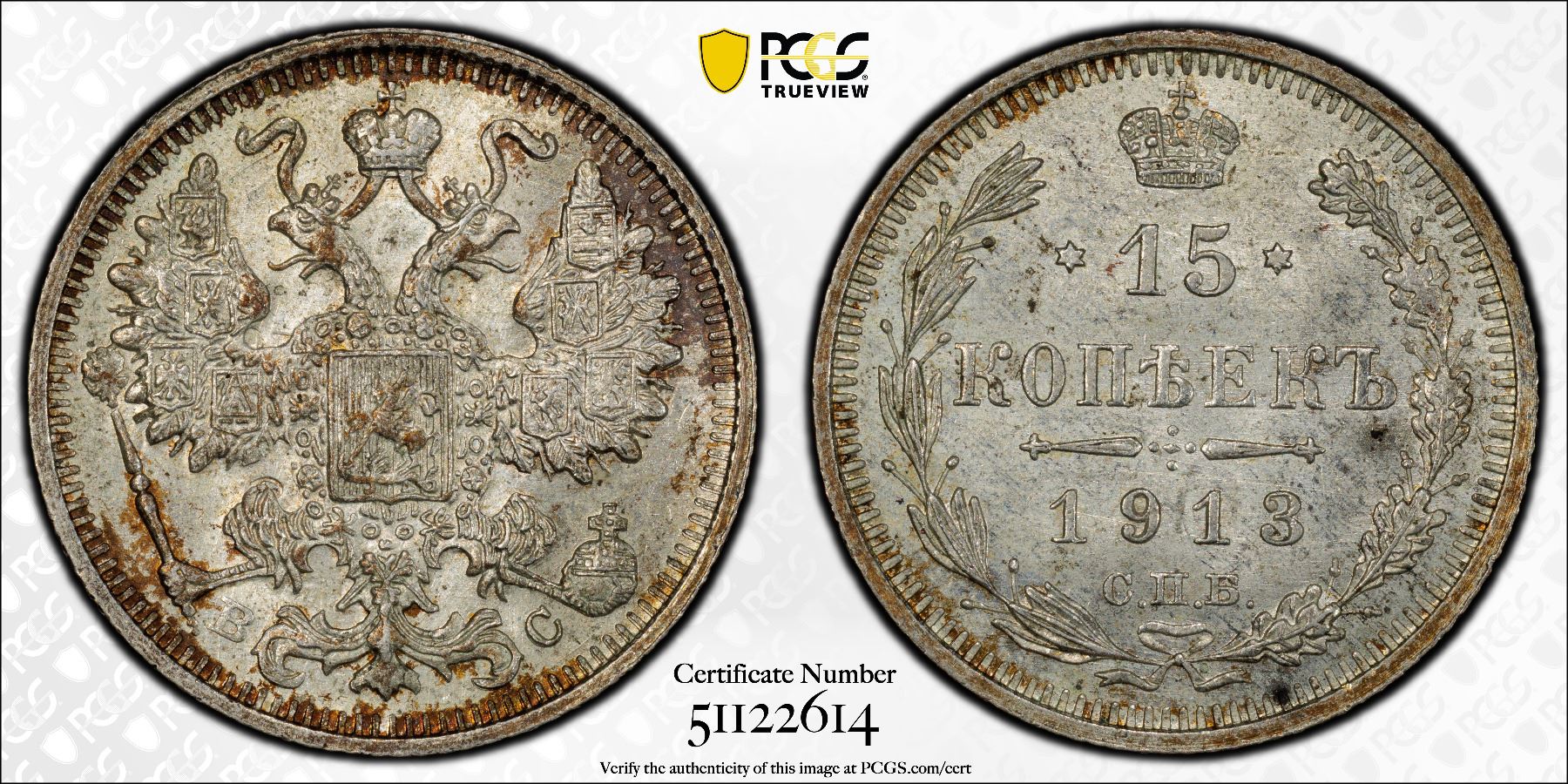 RUSSIA: Nicholas II, 1894-1917, AR 15 kopecks, 1913, PCGS MS65