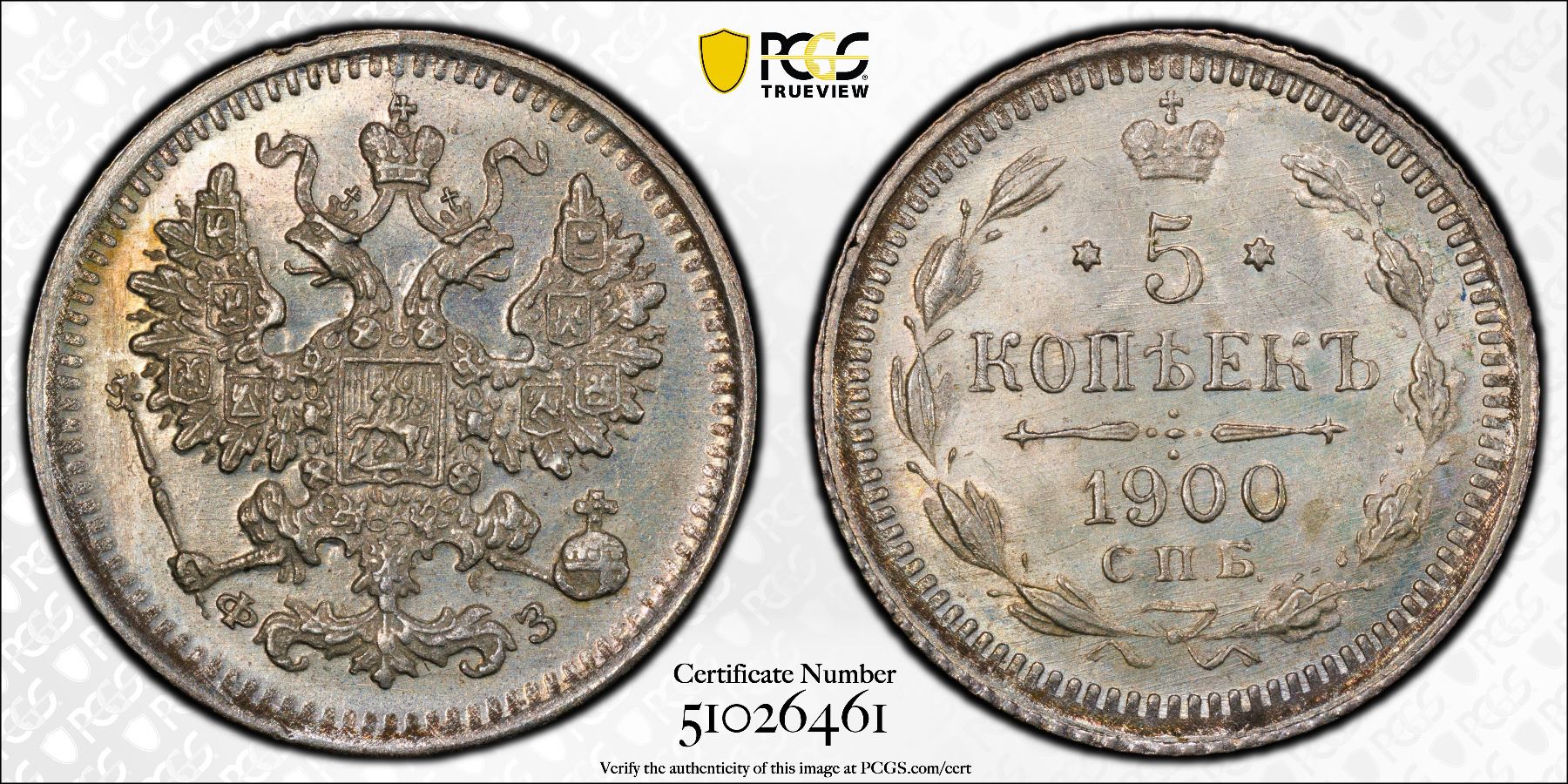 RUSSIA: Nicholas II, 1894-1917, AR 5 kopecks, 1900, Y-9a.1, Bit-175, St. Petersburg mint, Feliks Zaleman mint master, a superb quality example! PCGS graded MS65, ex Almer H. Orr III Collection.
