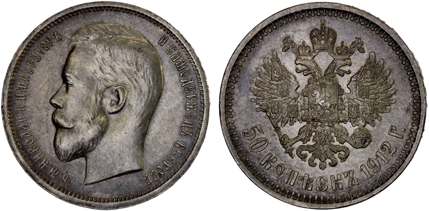 RUSSIA: Nicholas II, 1894-1917, AR 50 kopeks, 1912, Choice AU