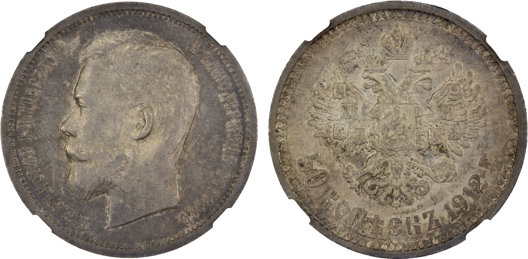 RUSSIA: Nicholas II, 1894-1917, AR 50 kopeks, 1912, Y-58.2, Bit-91, St. Petersburg Mint, Elikum Babayanz mintmaster, an attractive nearly mint state example, NGC graded AU58.