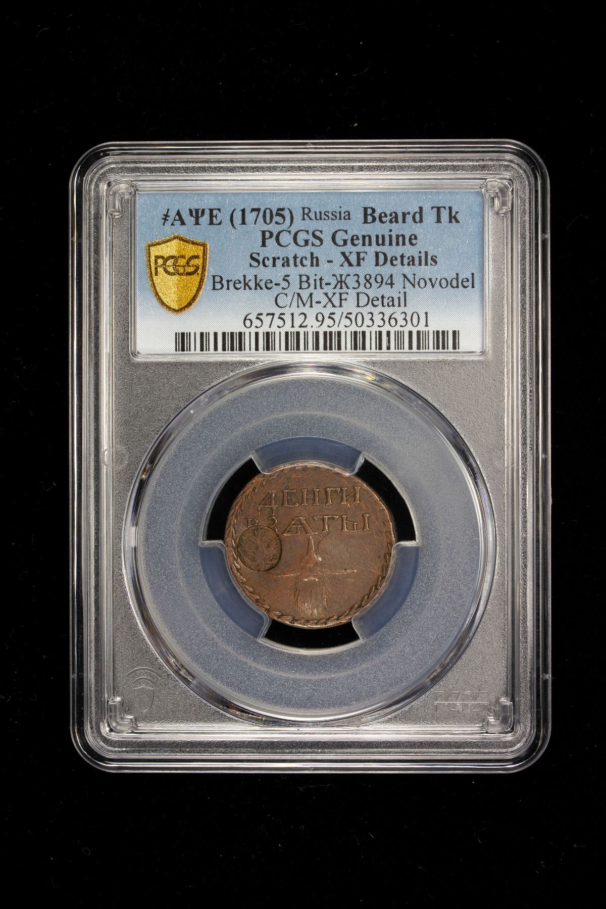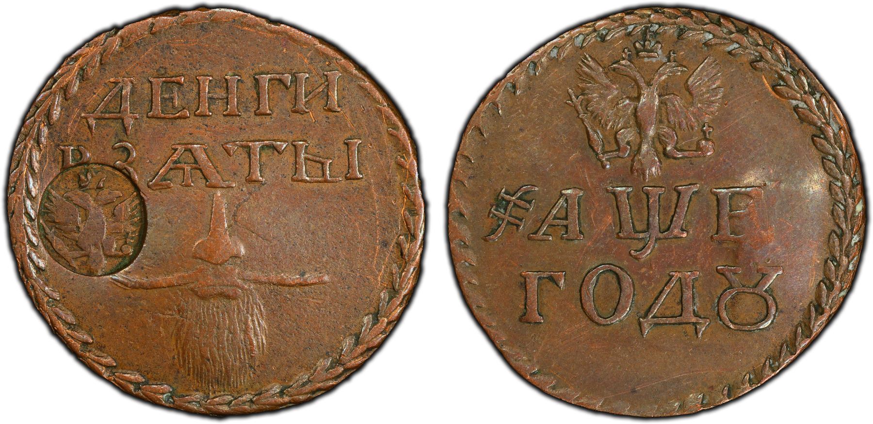 RUSSIA: Peter I, the Great, 1696-1725, AE beard token, 1705, Brekke-5, Bit-3894, Novodel type, narrow beard type; crowned double-headed eagle over date // denomination above nose, moustache, lips and beard, counterstamped with double-headed eagle, scratch, PCGS graded XF details, ex Dr. Robert A. Rosenfeld Collection. In 1698, Tsar Peter I of Russia instituted a beard tax as part of an effort to bring Russian society in line with Western European models. To enforce the ban on beards, the tsar empowered police to forcibly and publicly shave those who refused to pay the tax. Those who paid the tax were required to carry a "beard token." However, from a financial standpoint, the tax was unsuccessful due both to the relatively low number of people unwilling to shave their beards and an overestimation of the ability of the Russian state to administer and collect the tax. In 1772, the tax was formally repealed by Catherine the Great.
