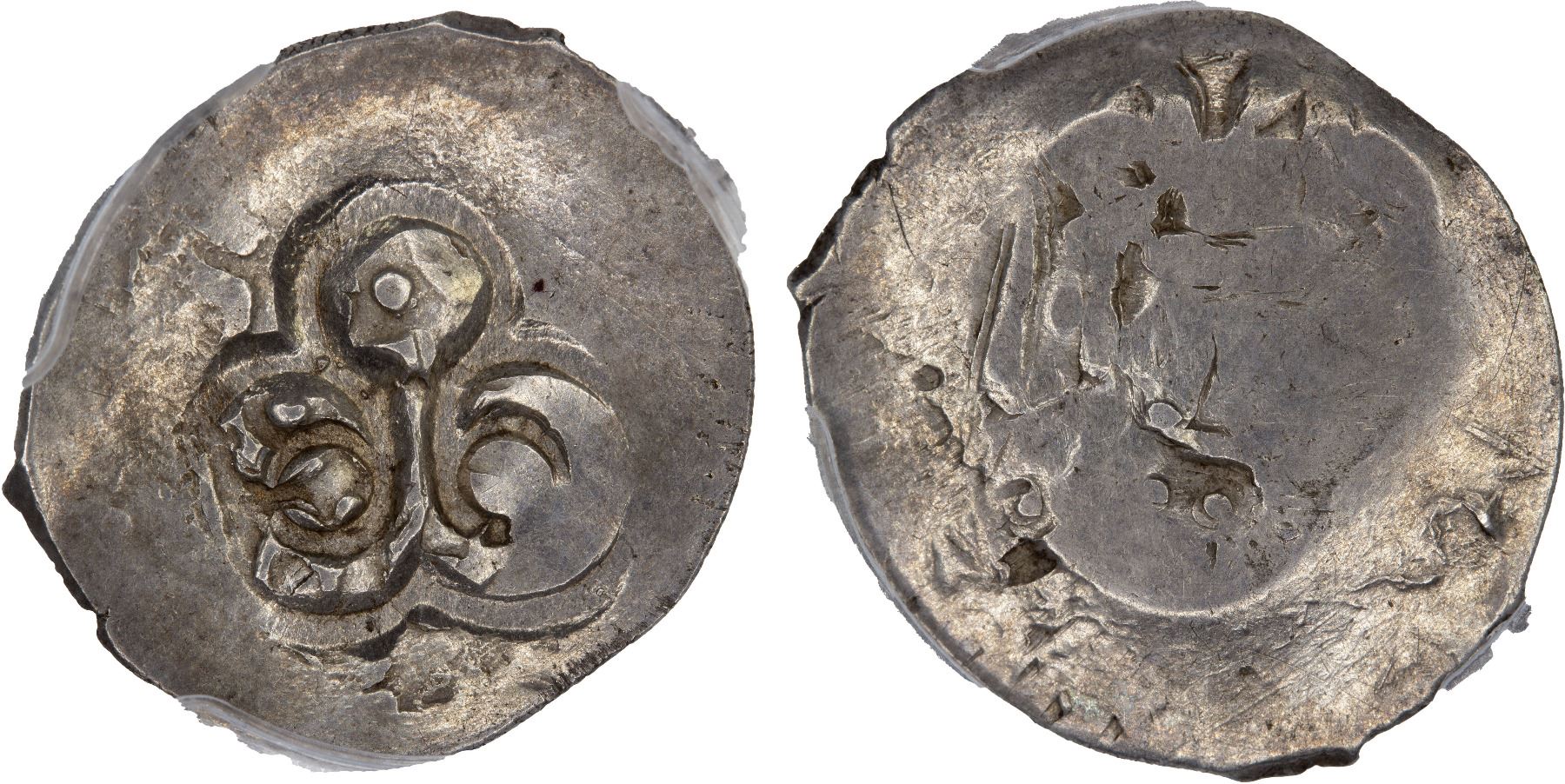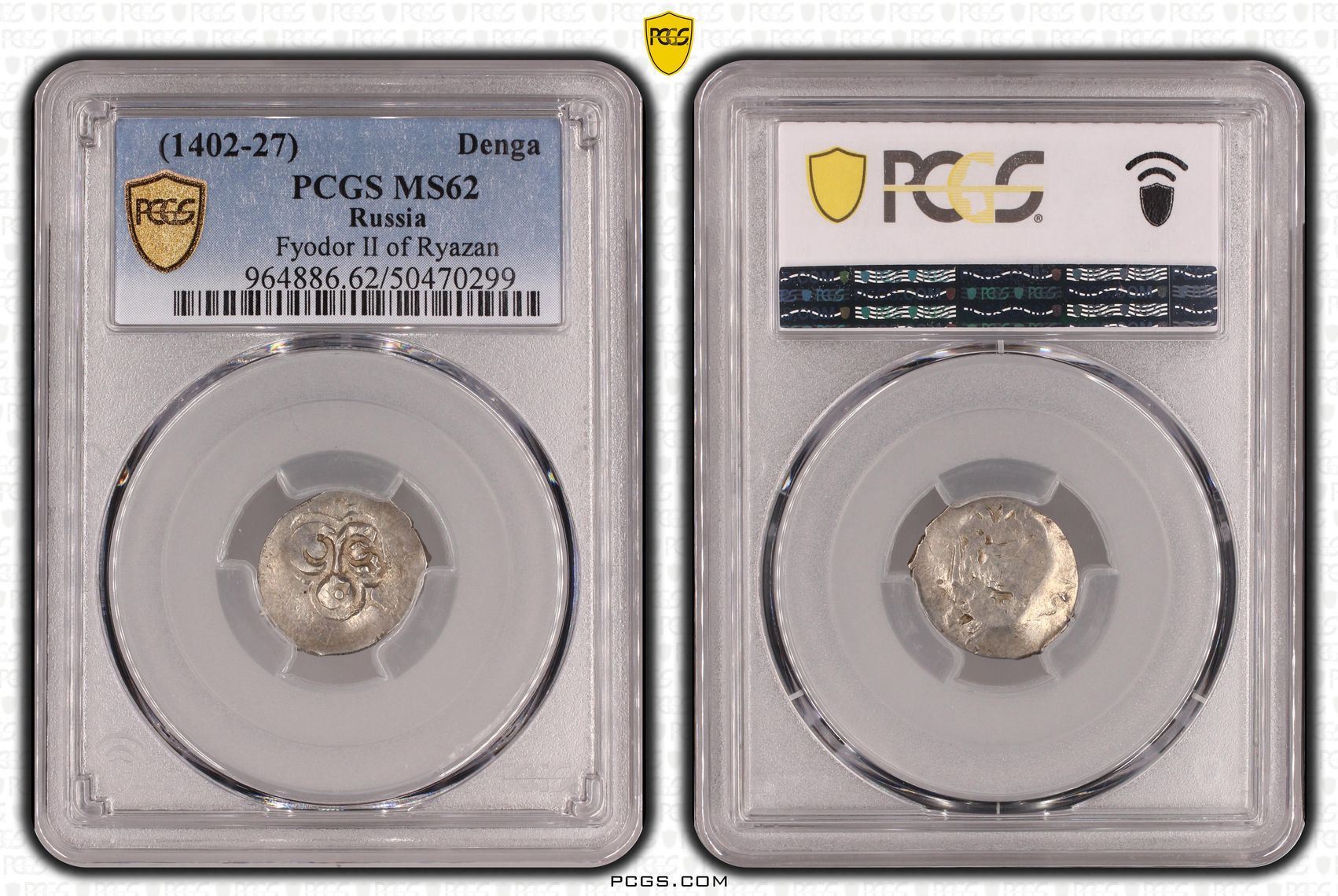 RUSSIA: RYAZAN: Fyodor Ol'govich, 1402-1427, AR denga, HP-5874ff, Ryazan tamgha on uncertain host, attractive luster, PCGS graded MS62.