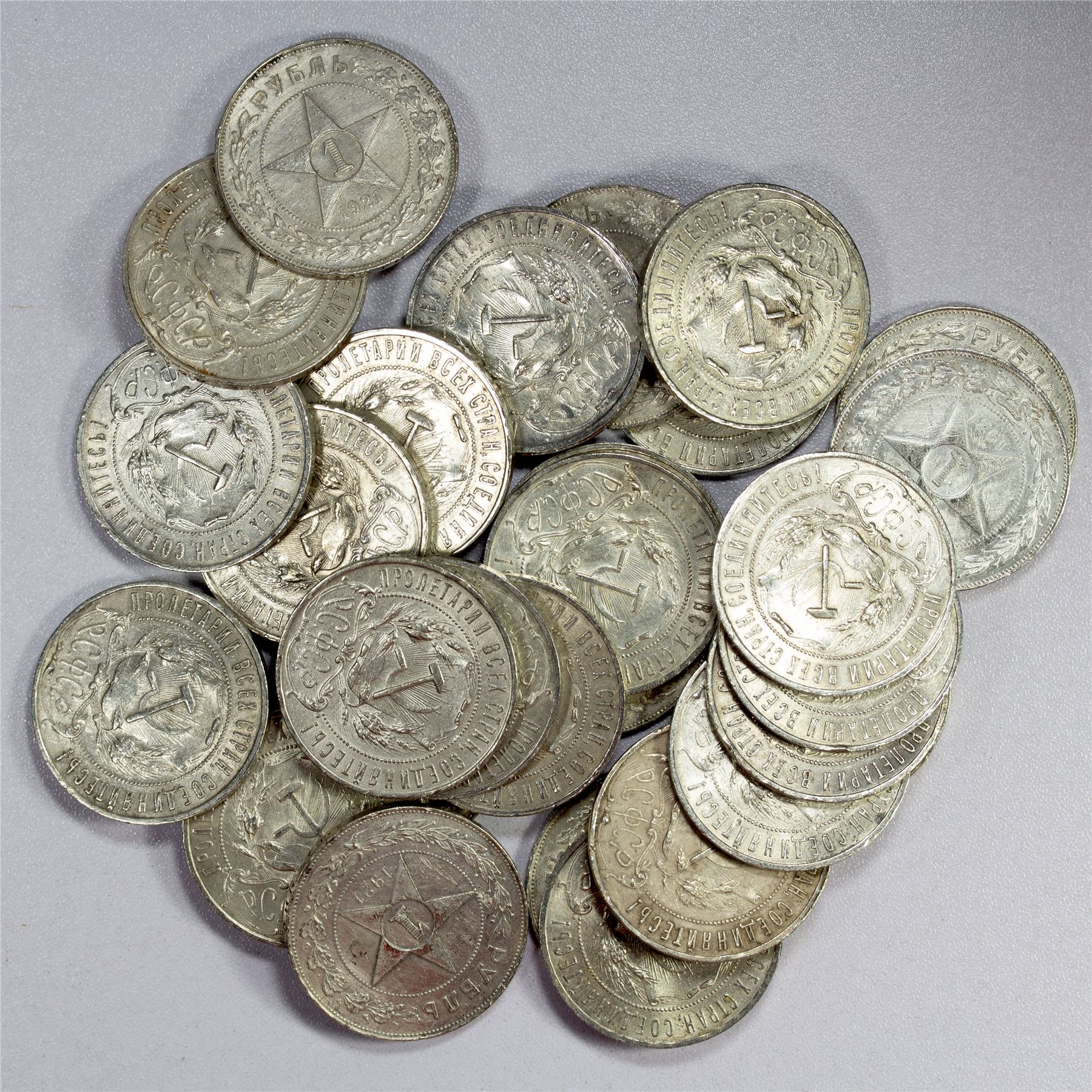 RUSSIA (S.F.S.R.): LOT of 30 coins, group of Soviet Russia 1921 silver rouble coins Y-84 type, with Russian legend "Workers of the world, unite!", some minor rim nicks and surface hairlines, otherwise mostly EF to AU quality, retail value $2300, lot of 30 coins.