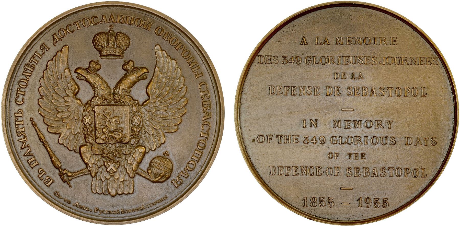 RUSSIA: U.S.S.R., AE medal (97.54g), Paris, 1955 (1978), cf. Baldwin's Auction 69, Lot 284, 59mm bronze medal on the Centenary of the Defense of Sebastopol During the Crimean War by Daniel Flourat after a design by N. V. Zaretsky for the Society of Lovers of Russian Military Antiquity, with Cyrillic legend around with name of the issuing society below // A LA MEMOIRE / DES 349 GLORIEUSES JOURNEES / DE LA / DEFENSE DE SEBASTOPOL / IN MEMORY / OF THE 349 GLORIOUS DAYS / OF THE / DEFENCE OF SEBASTOPOL / 1855 - 1955, in Paris Mint box, BRONZE and cornucopia privy mark on edge, Unc.