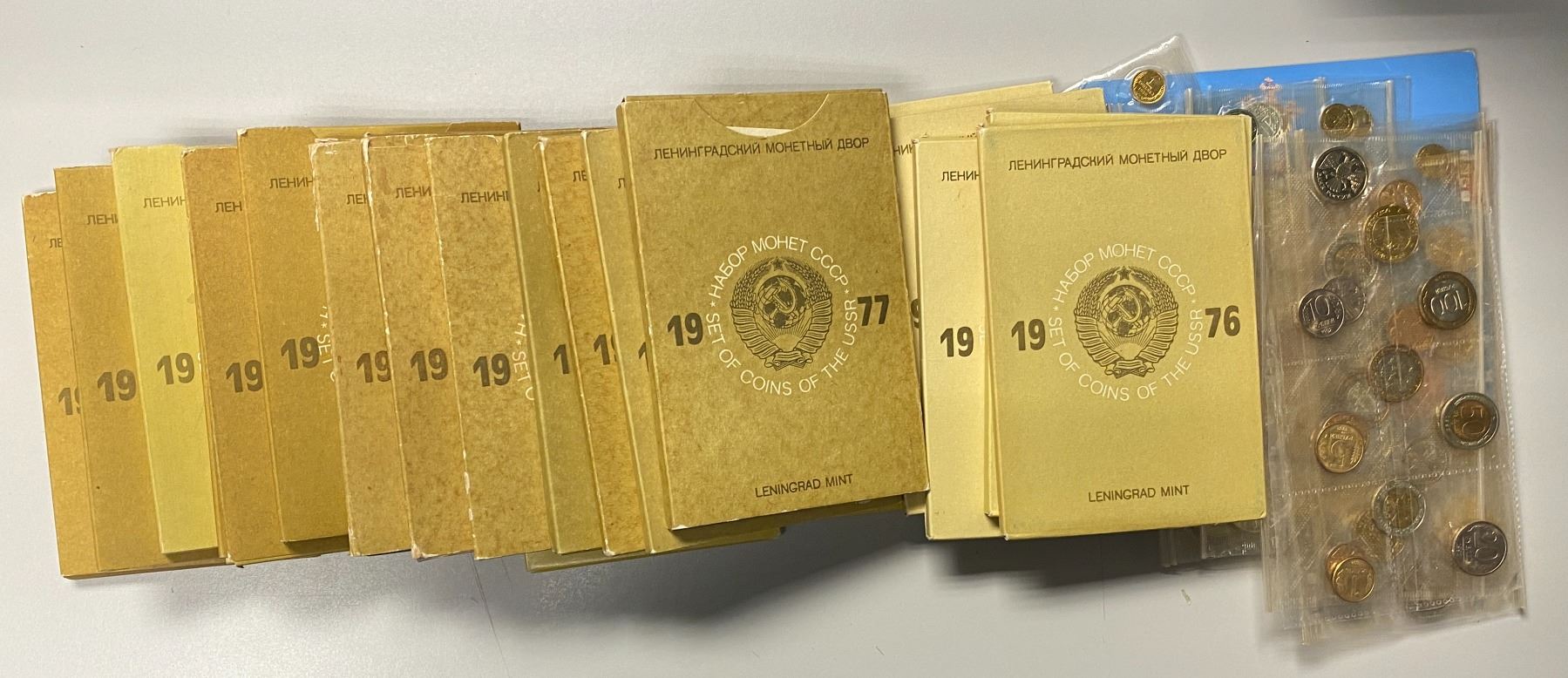 RUSSIA: U.S.S.R.: LOT of 31 sets, including Mint Sets: 1976 (5 sets), 1977 (8), 1978 (6), 1988 (6, no boxes), 1990 (2), 1991 (1, Govenment Bank folder), and 1992 (3, Russian Federation, no boxes); all prooflike unc in original packaging; retail value $1100, lot of 31 sets.