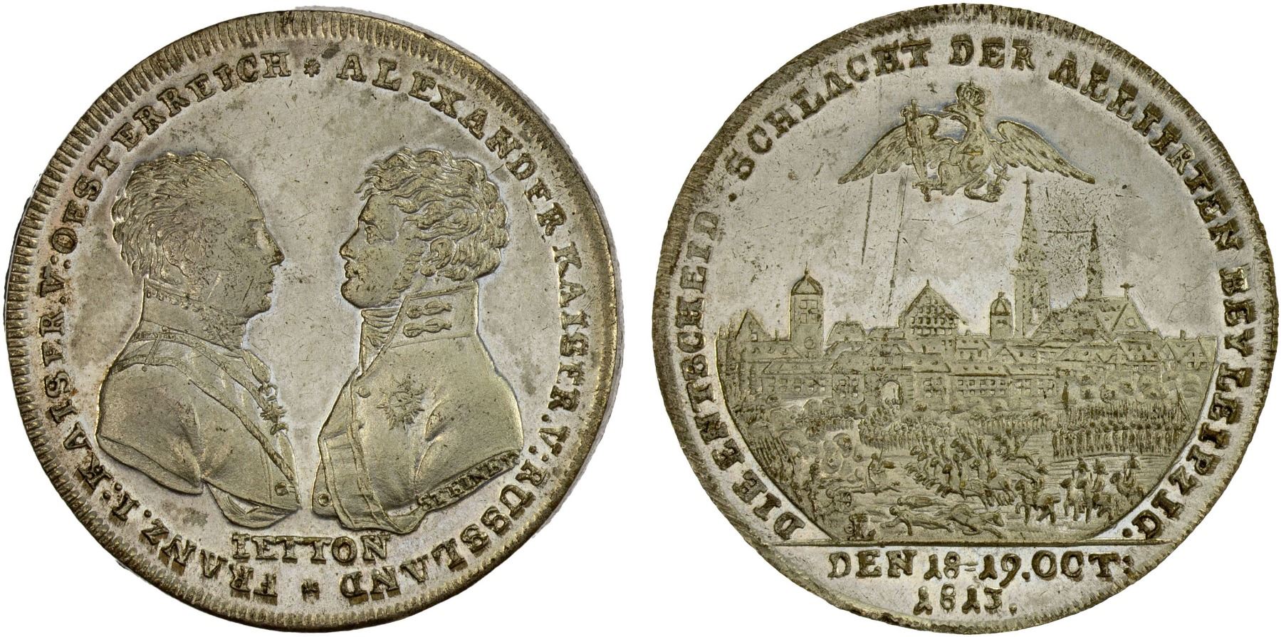 RUSSIA: silvered AE jeton, 1813, Diakov-368.2, Bramsen-1259, 33mm, Aleksandr I Pavlovich, with Franz I of Austria, Battle of Leipzig medal by Stettner dated October 18-19, 1813; FRANZ I : KAISER V : OESTERREICH ALEXANDER KAISER V : RUSSLAND, confronted uniformed busts of Aleksandr and Franz; JETTON below // DIE ENTSCHEID : SCHLACHT DER ALLIERTEN BEY LEIPZIG, view of the Battle of Leipzig; crowned eagle above, holding sword; in exergue, "DEN 18-19 : OCT : 1813", a few light scratches in reverse field, Unc.