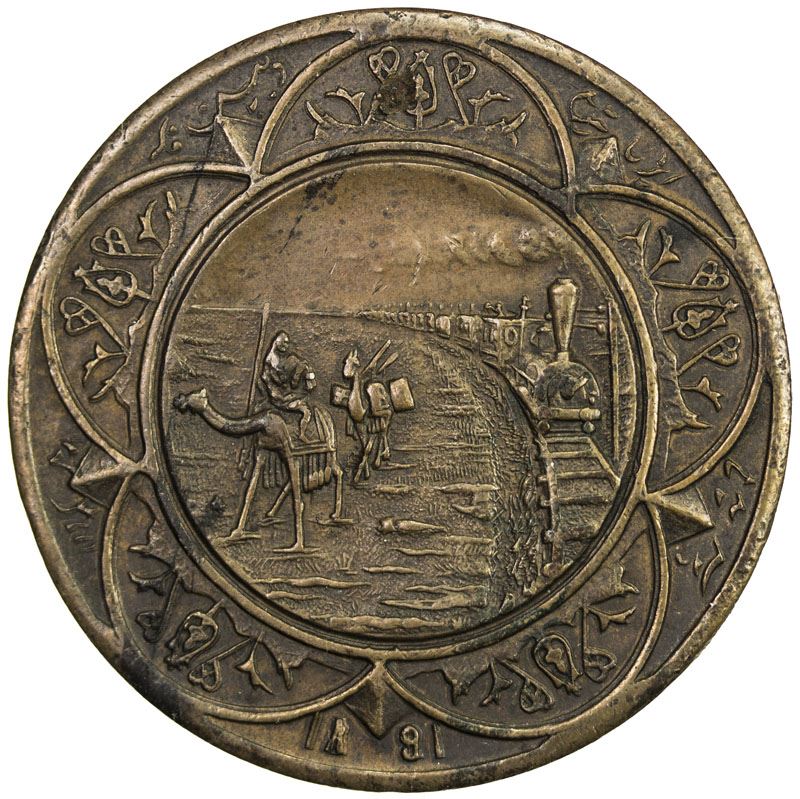 RUSSIAN EMPIRE: AE medal (27.54g), 1891, Diakov-1061.2, 40mm medal for the Central Asian Exposition by I. Gebhardt, two crowned armorial shields on crowned and draped background, all within circle and Cyrillic legends, date, and ornaments around / Bedouin driving two camels next to locomotive, with ornate symbols and arabic legends around with date below, small obverse rim bump, Choice VF.