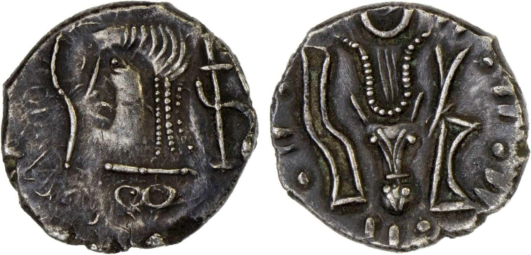 SABAEAN: Anonymous, ca. 2nd-3rd centuries AD, AR unit (1.56g), Huth-305, Bucranium series, diademed head left, symbol of Almaqah before, symbol of Athtar (Ishtar) behind, horizontal South Arabian T in exergue // head of Arabian oryx facing, flanked by two symbols, Choice VF.