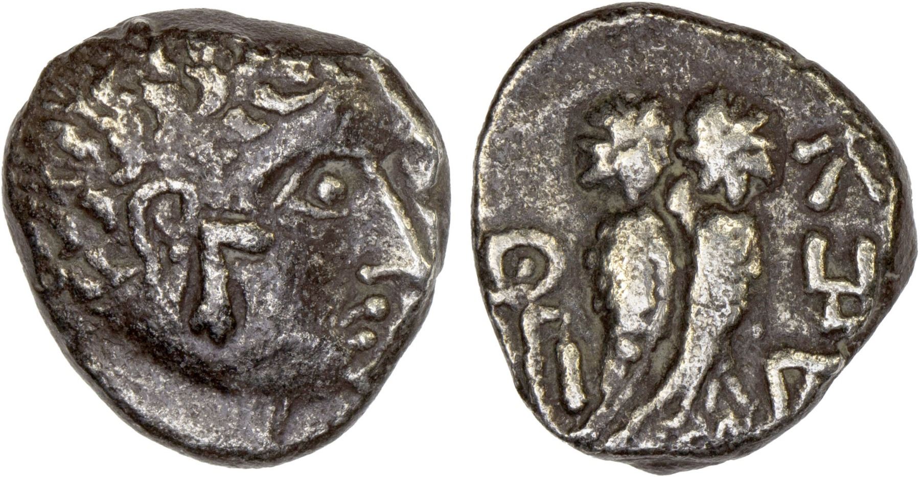 SABAEAN: Anonymous, ca. 2nd century BC, AR 1/2 unit (2.54g), cf. Huth-274-75 (unpublished monogram), imitating Athenian issues, male head right, mark of value on cheek // owl standing right with head facing, olive spray to right above, South Arabian monogram to either side, VF.
