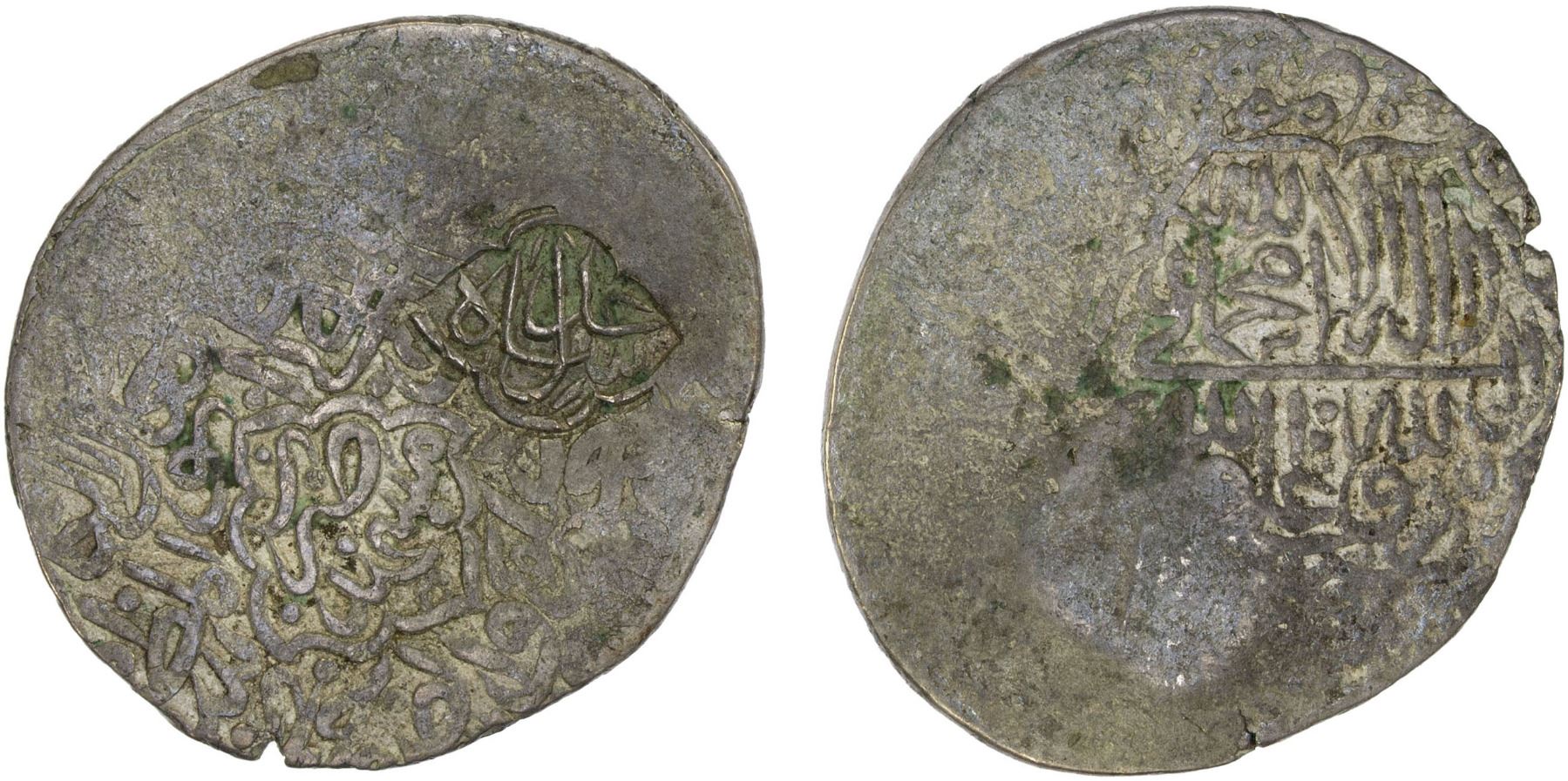 SAFAVID: Isma'il I, 1501-1524, AR ½ shahi (4.86g), NM, ND, A-2589, countermarked just 'adl shah on type A-2484, half shahi or Mashhad, ND, the host about 25% flat strike, bold EF countermark on VF host, RR.