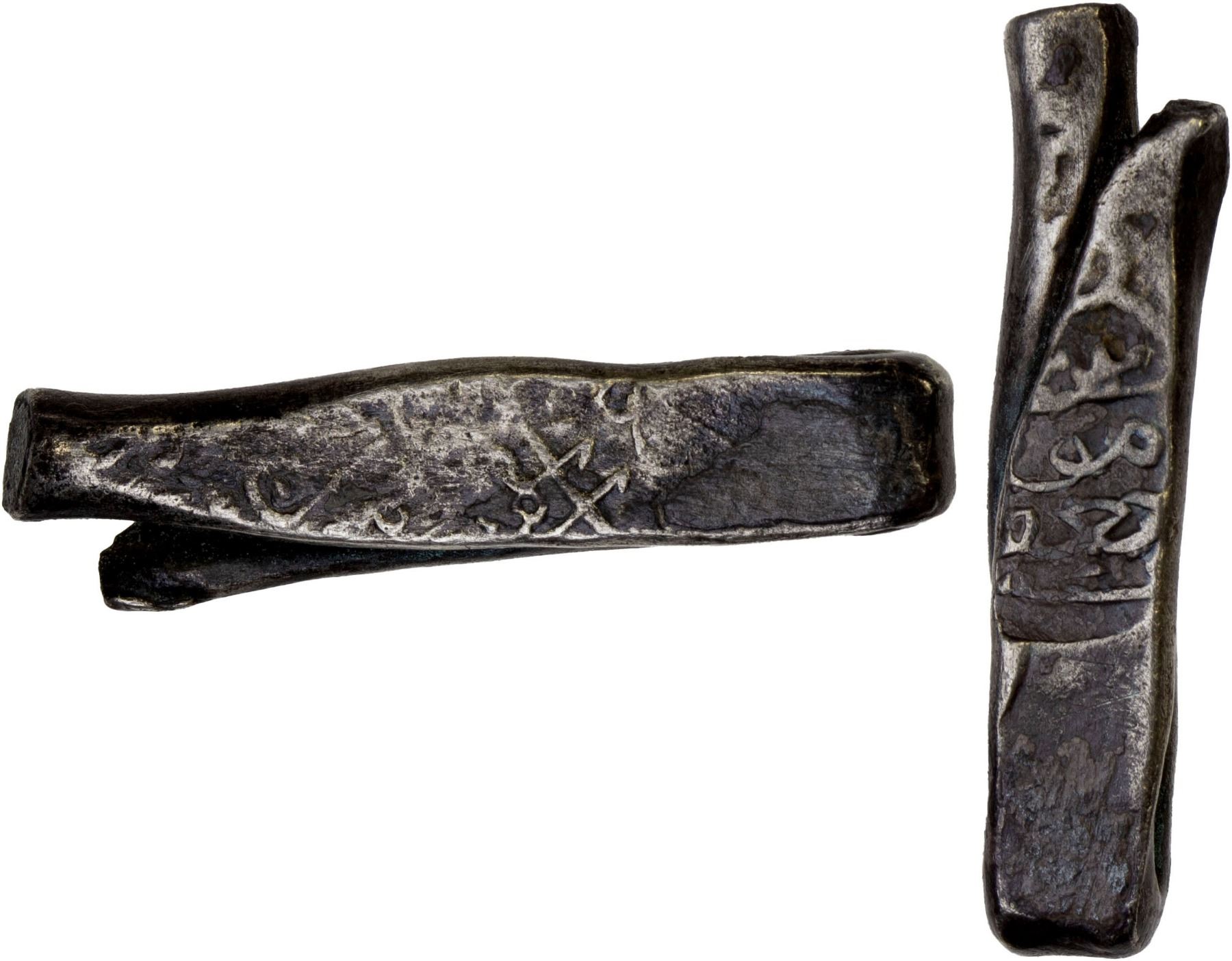 SAFAVID: Tahmasp I, 1524-1576, AR larin (4.91g), NM, ND, A-2610, struck from regular coin dies with the millsail reverse, F-VF. The larin standard of 5.15g was retained during the reign of Isma'il I, reduced to about 4.90g at some point early in the reign of his successor Tahmasp I.