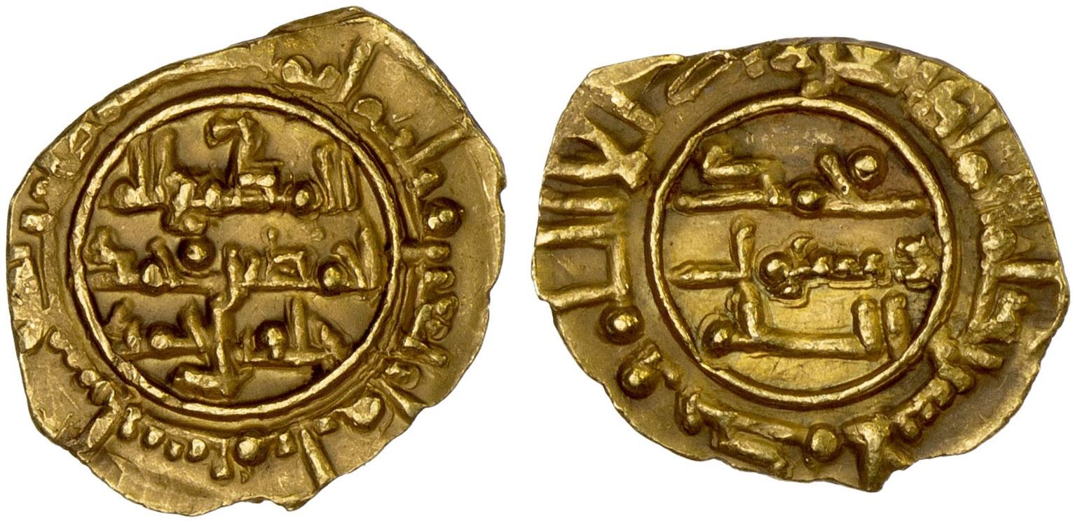 SAFFARID: Ahmad b. Muhammad, 923-963, AV fractional dinar (0.69g), Sijistan, AH343, A-1411, citing his son Khalaf b. Ahmad and the caliph al-Muti', bold XF, RR. Examples of type A-1411 citing both Ahmad b. Muhammad and his son Khalaf b. Ahmad are known dated AH340-343.
