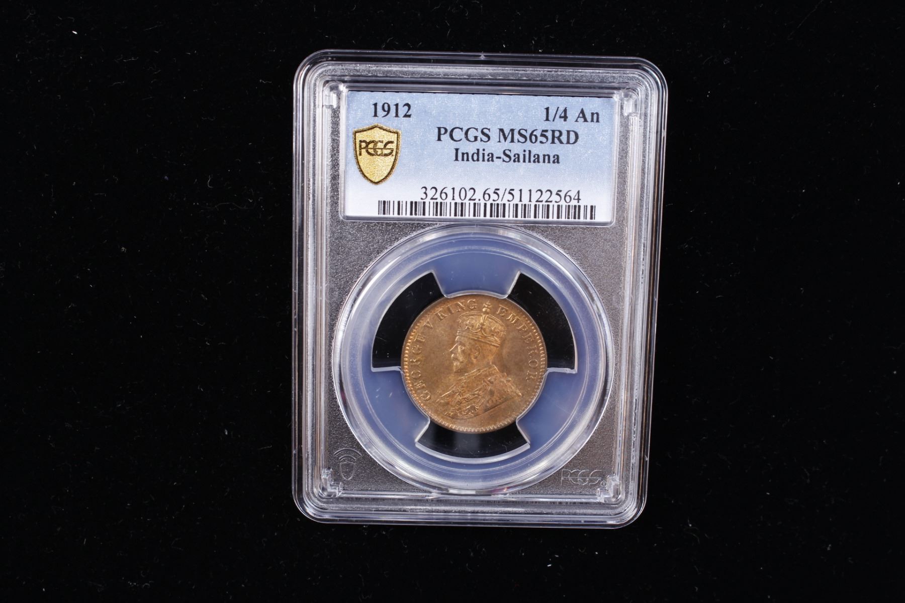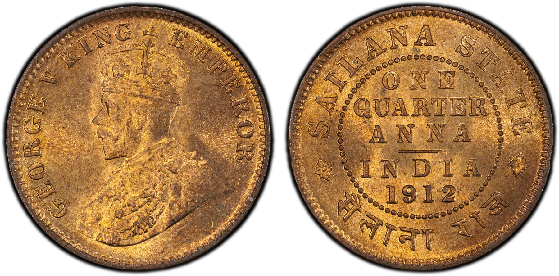 SAILANA: Jaswant Singh, 1890-1919, AE 1/4 anna, 1912, KM-16, regal issue with portrait of George V, a superb red lustrous example! PCGS graded MS65 RD.