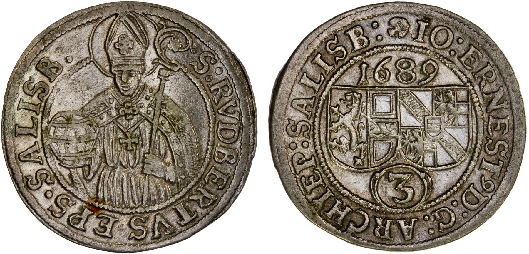 SALZBURG: Johann Ernst von Thun, 1687-1709, AR 3 kreuzer, 1689, KM-249, an attractive example, XF-AU.