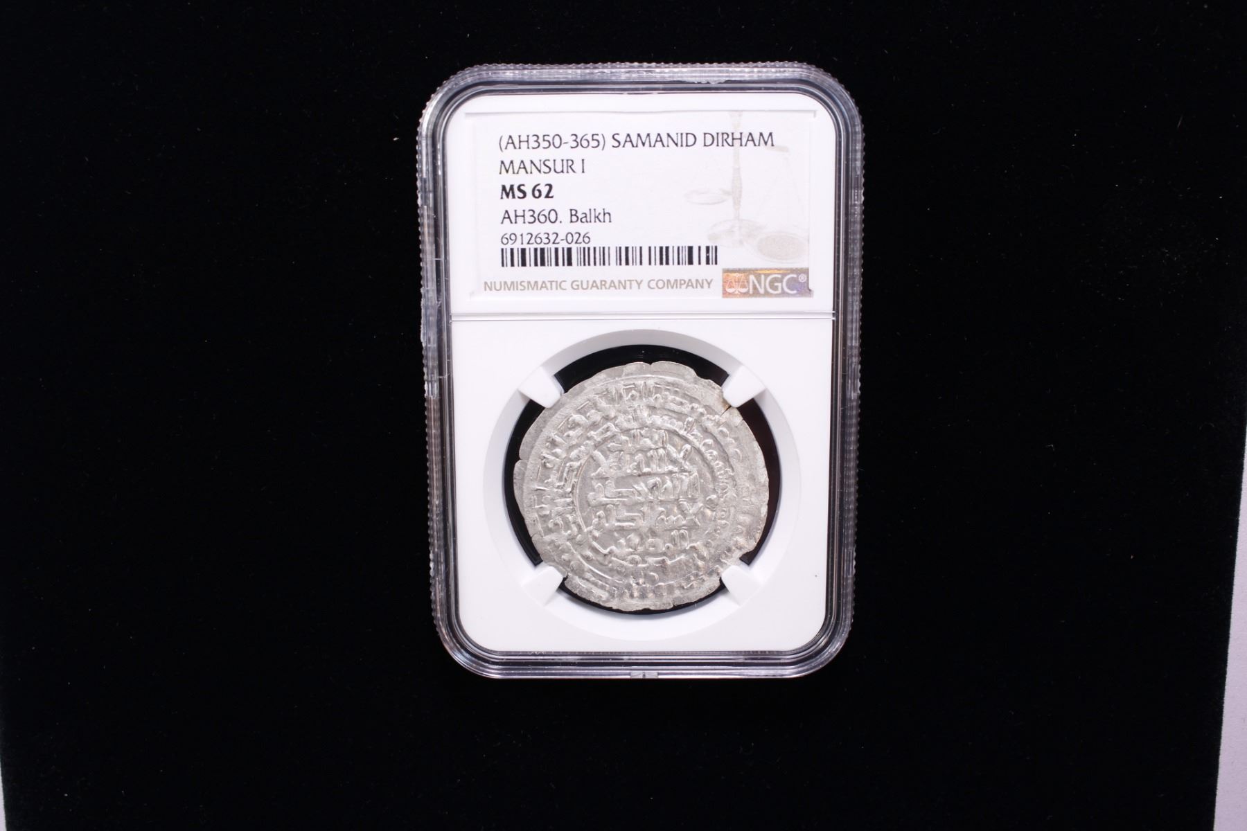 SAMANID: Mansur I, 961-976, AR dirham (3.43g), Balkh, AH360, A-1466, NGC graded MS62.