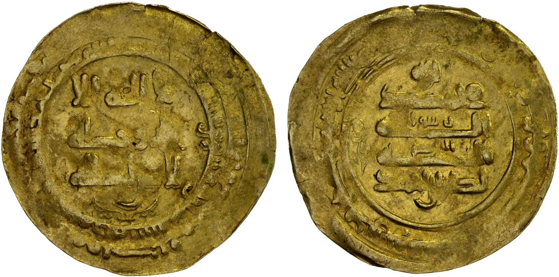 SAMANID: Nasr II, 914-943, AV dinar (2.28g), al-Muhammadiya, AH328, A-1449, Zeno-264510 (this piece, with important discussion), unusual variant with rasul and al-radi added in tiny script after having been omitted by the engraver; some weakness, mint & date sufficiently legible, VF.