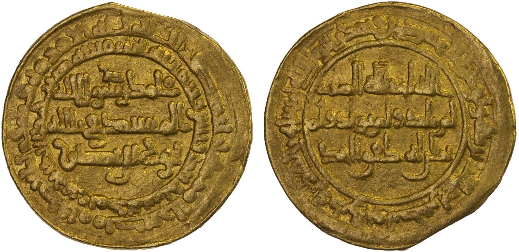 SAMANID: Nuh II, 943-954, AV dinar (4.06g), al-Muhammadiya (= Rayy), AH333, A-1454A, special issue with Qur'an sura 112 filling the reverse field, struck at Samarqand in AH332 and at several mints in 333; slightly uneven surfaces, full legends on both sides, VF, RR.