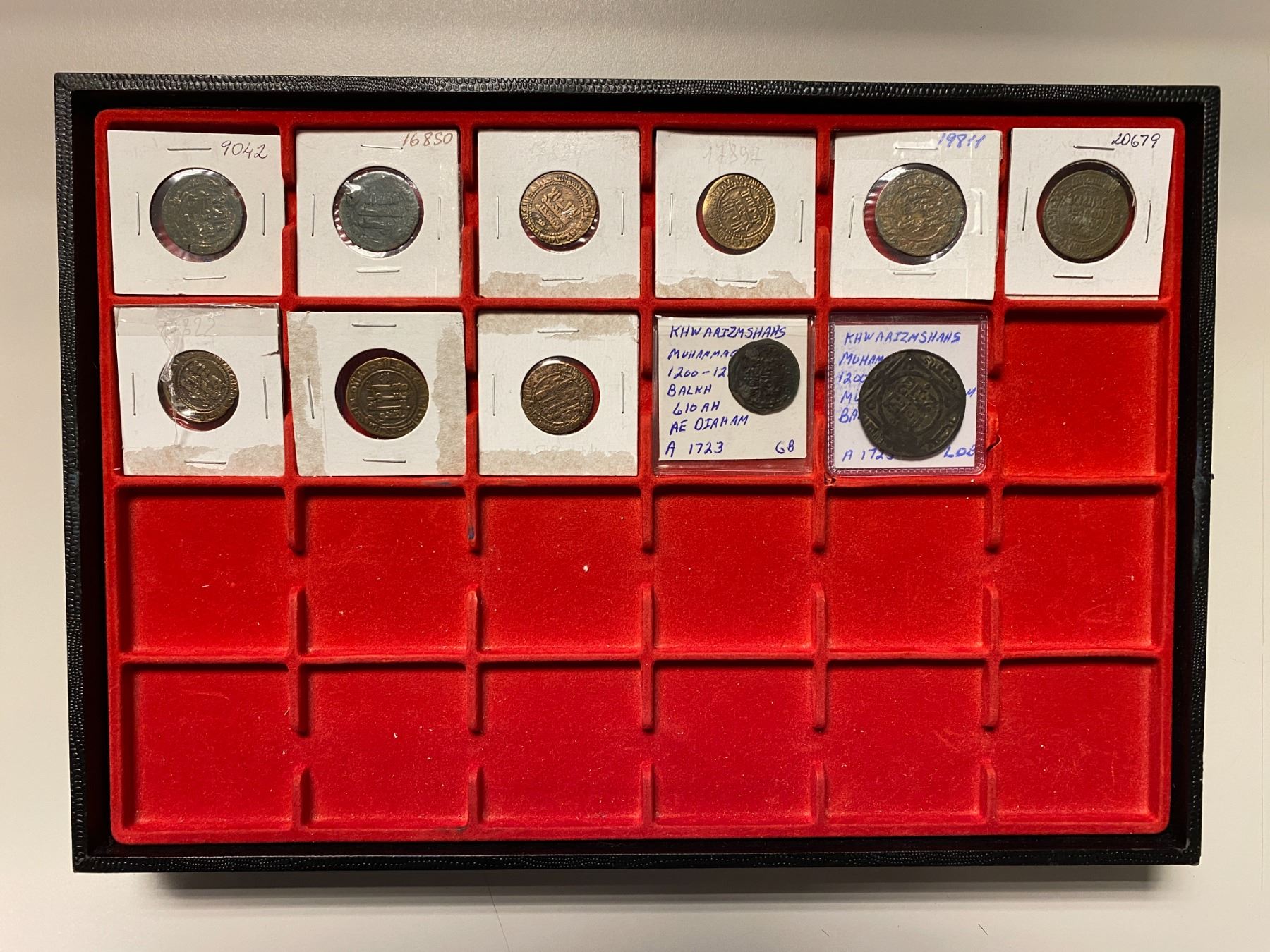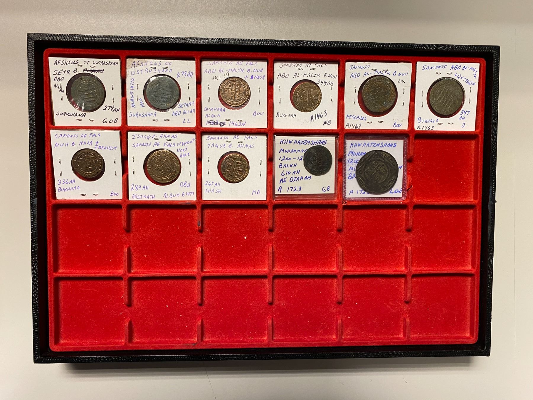 SAMANID, etc.: LOT of 11 copper coins, Samanid: al-Shash AH265, Akhsikath 284, Bukhara 336, 347, and 349 (2 pcs), and Ferghana DM, mostly F-VF and all but Ferghana with clear date; Afshinid: Usrushana mint, type dated 279, but date unclear on both, average VG condition; and Khwarizmshah, Balkh mnit, both with legible date, average F-VF; all with the consignor's attribution; retail value $475, lot of 11 pieces.
