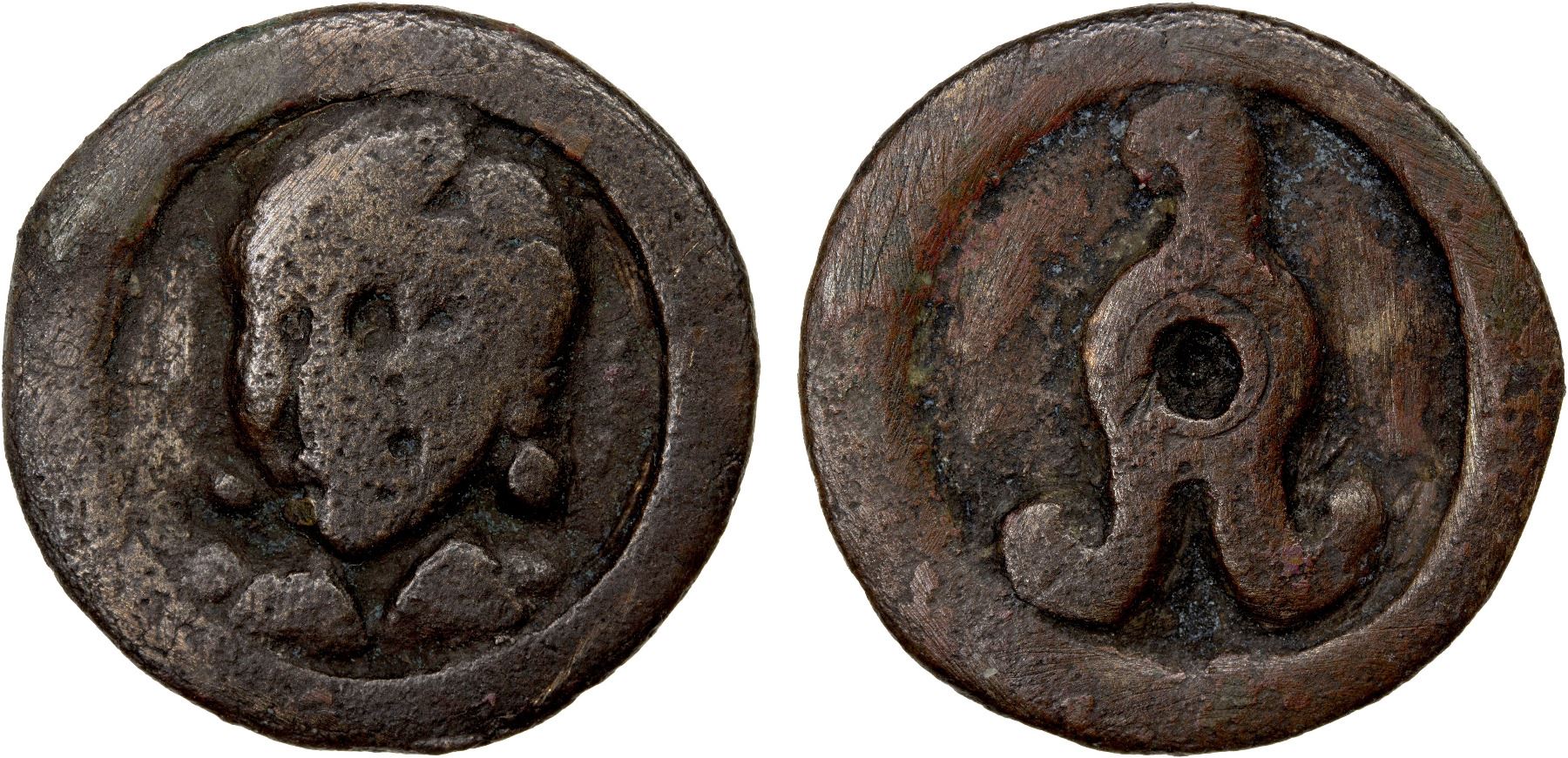 SAMARKAND: Anepigraphic, ca. 575-600, AE unit (2.97g), Zeno-254492, Smirnova-1, Zeimal-17, human bust turned slightly to the left // tamgha of Samarkand, F-VF, R.