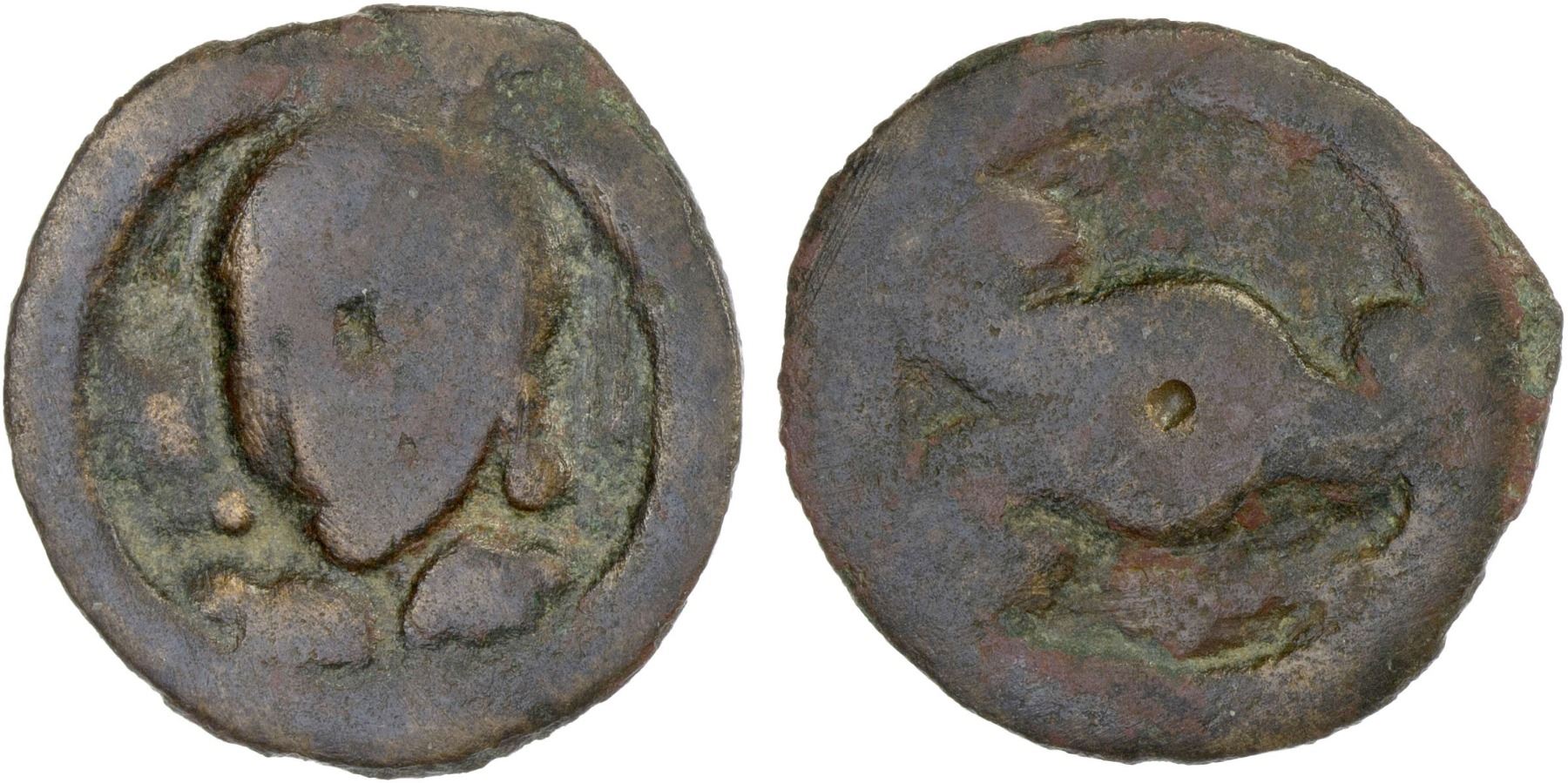 SAMARKAND: Anonymous, 6th century, AE portrait cash (2.41g), Smirnova-33, cf. Zeno-220386, long-haired portrait // Samarkand tamgha, traces of a Sogdian legend around, weakly struck reverse as usual, Fine, RR.