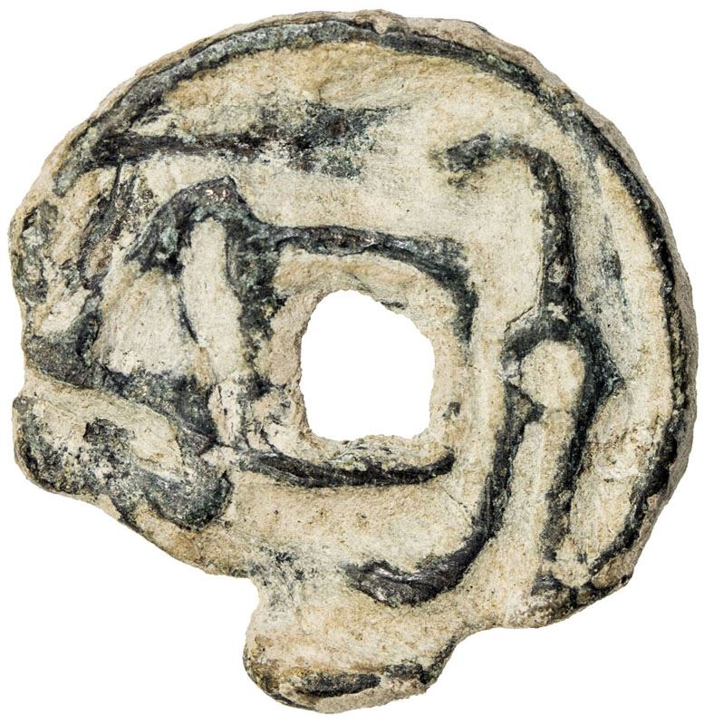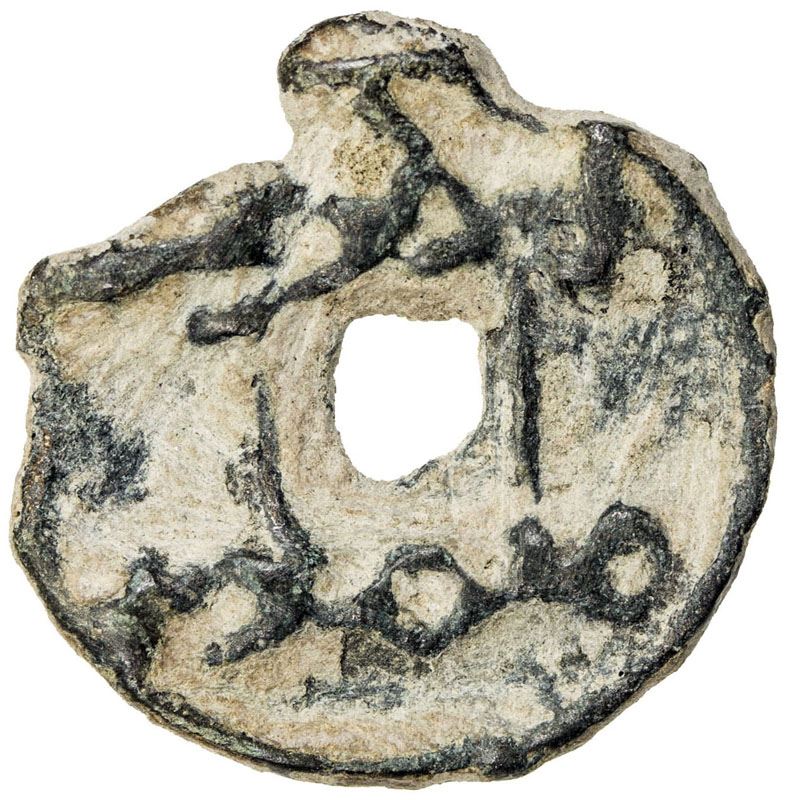 SAMARKAND: Wuzurg, ca. 645-650, AE cash (2.52g), Smirnova-78ff, Zeno-6875, Sogdian text, with MLKA at the top (found only for this ruler) // 2 tamghas, VF, ex Hans Mondorf Collection.