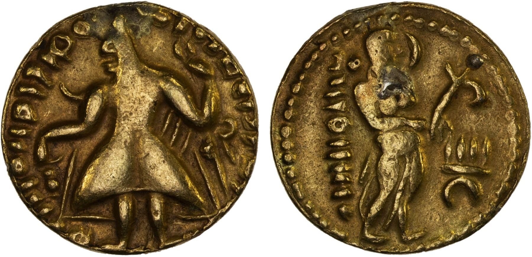 SAMATATA: Anonymous, ca. 450-500, AV dinar (6.60g), ECB-SAM.1A1, Kushan based design: king standing, derived from the standard obverse of Kanishka I // deity Ardoksho standing, holding lotus flower; totally debased Bactrian legends on both sides, bold VF-XF, RR, ex Syed Rabbi Collection.
