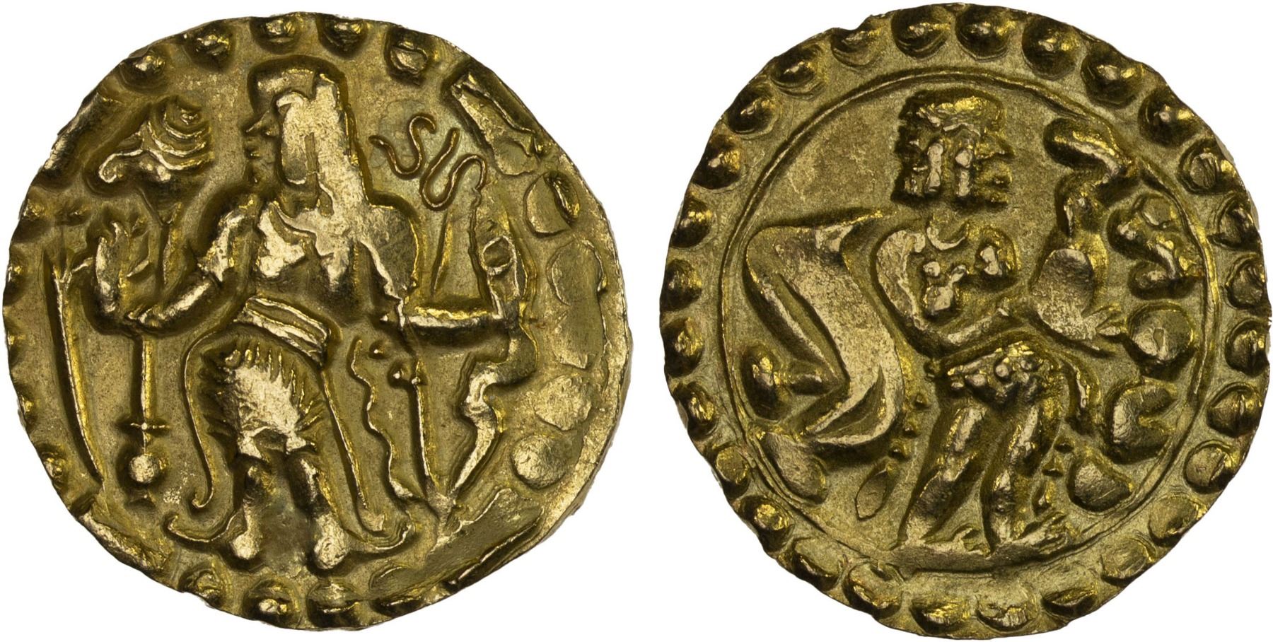 SAMATATA: Anonymous, ca. 500-550, AV dinar (5.88g), ECB-SAM.3.5, Rata dynasty: king standing, holding arrow in right hand and bow in left hand, standard with conch shell to left, no legend // stylized female figure, stylized "legend" to right, all within a circle, extra "curlicue" right of the king's head; fine gold; decent strike, lovely XF, R, ex Syed Rabbi Collection.