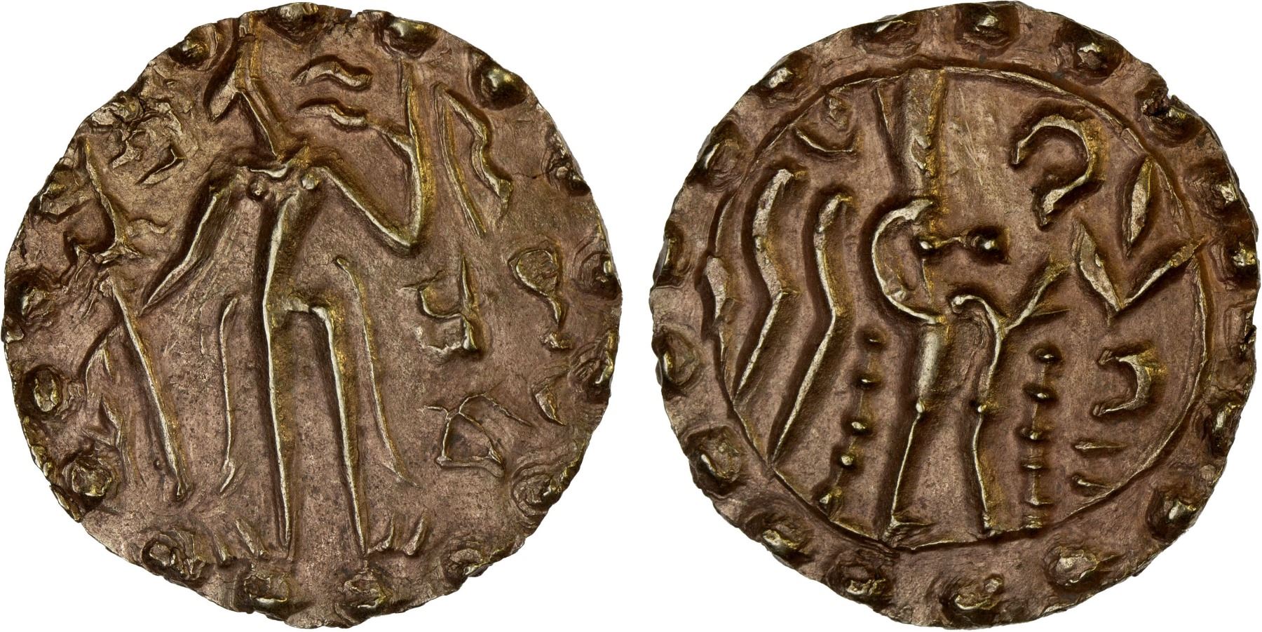 SAMATATA: Khadga dynasty, Prithubhata, ca. 695-700, AV dinar (5.57g), Mitch-BLA-75, ECB-SAM.19, king standing left, holding arrow in right hand and bow in left hand, prithubhata below left arm // goddess standing right, struck in gold somewhat debased with silver, attractive strike, XF.