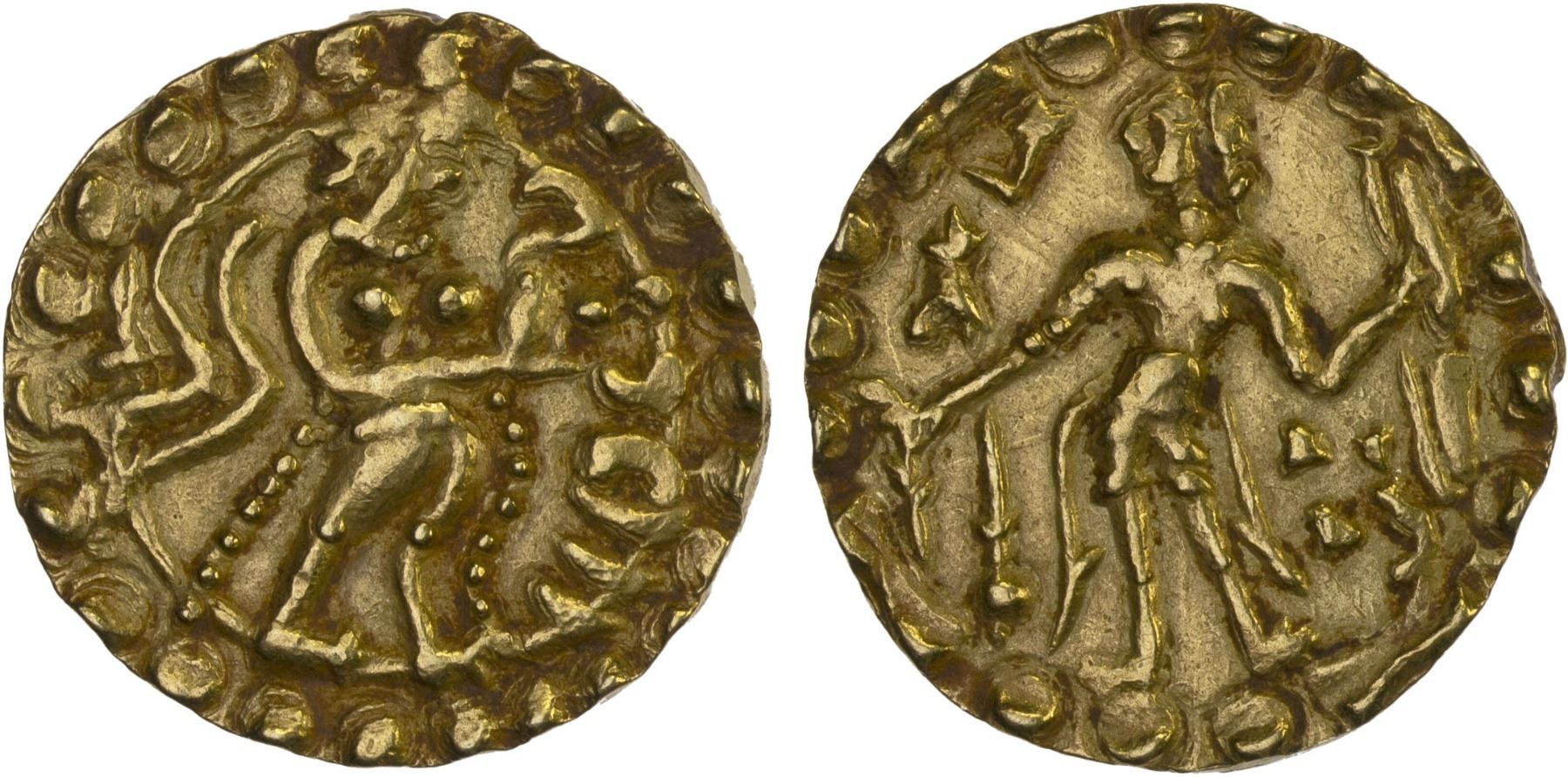 SAMATATA: Vira Chandra, ca. 574-577, AV dinar (5.83g), ECB-SAM.9.1, king standing, holding arrow in right hand and bow in left hand, standard to left, sri upper left, ruler's name in 4 tiny characters below left arm // stylized female figure, meaningless "legend" to right; decent strike, choice XF, RR, ex Syed Rabbi Collection. D.C. Sincar has tentatively assigned this name to Virachandra of Arakan.