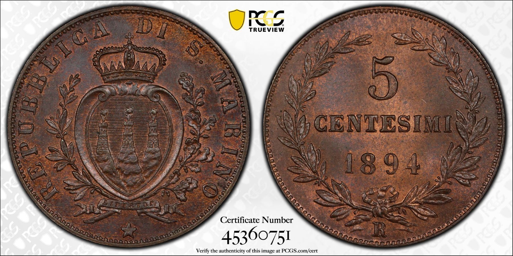 SAN MARINO: Republic, AE 5 centesimi, 1894-R, KM-1, a superb mint state example! PCGS graded MS65 BN.