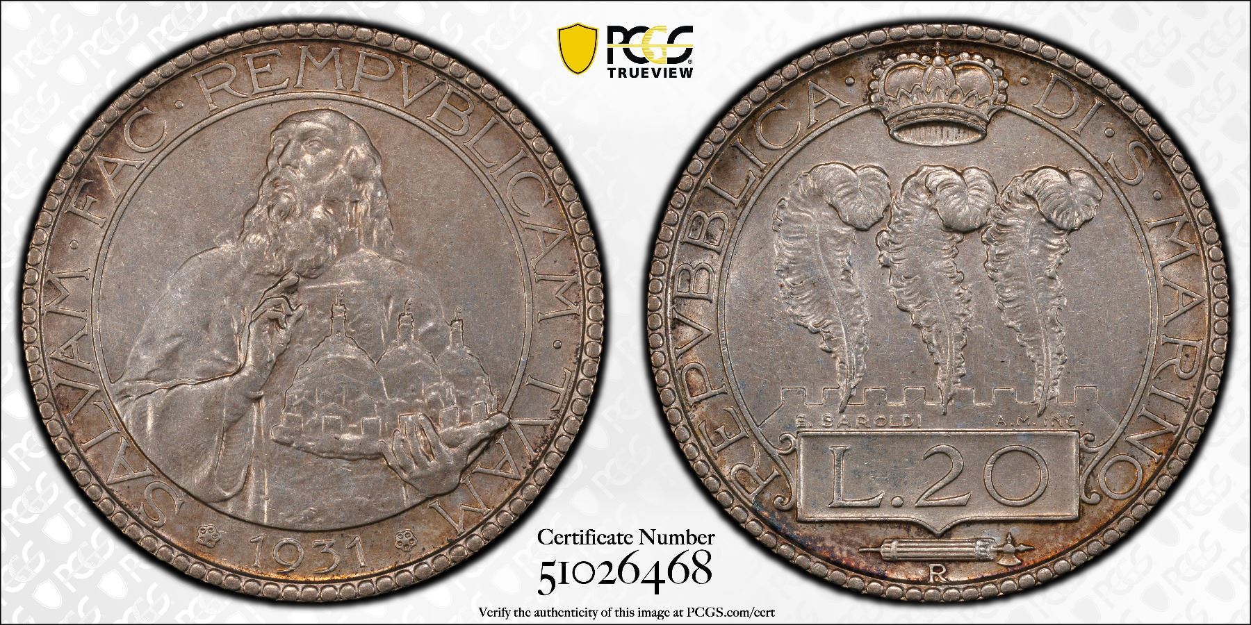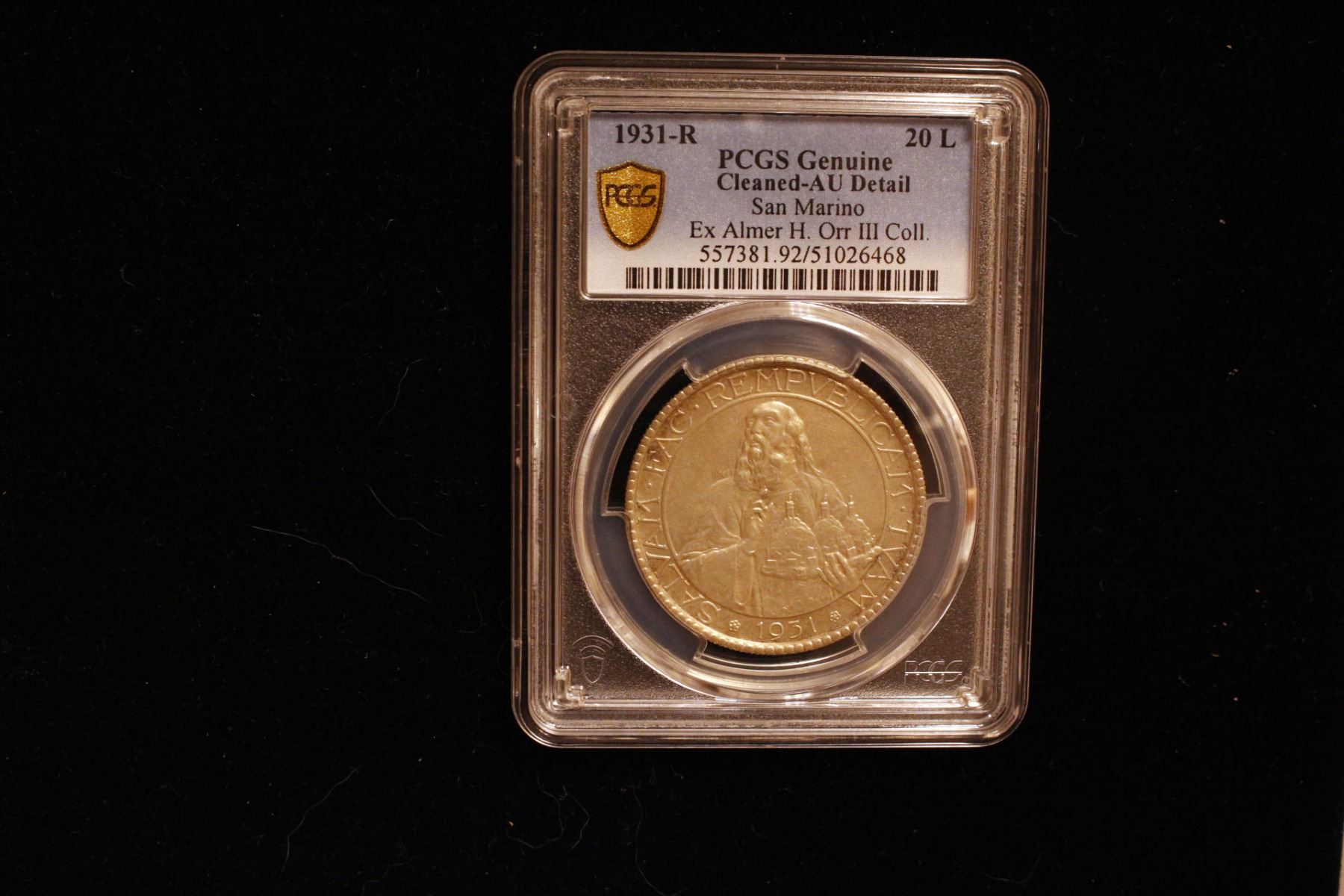 SAN MARINO: Republic, AR 20 lire, 1931-R, KM-11, cleaned, PCGS graded AU details, ex Almer H. Orr III Collection.