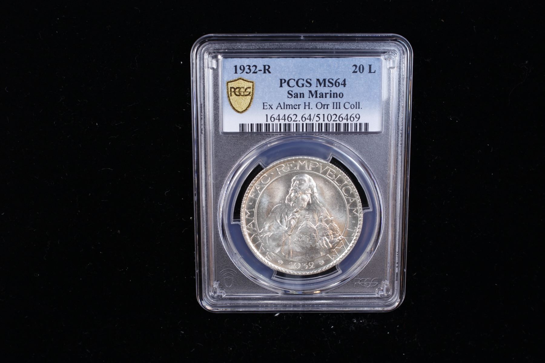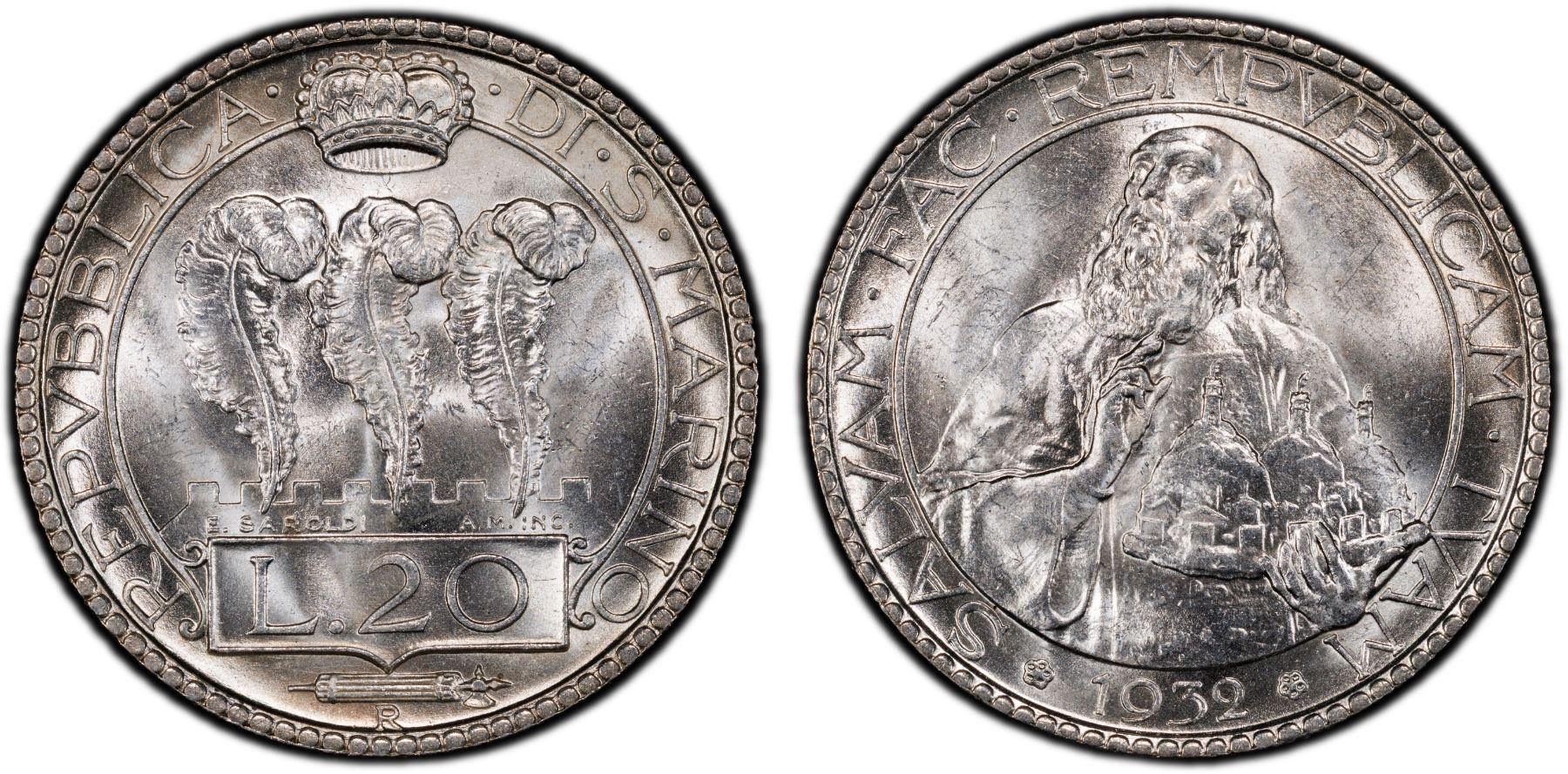 SAN MARINO: Republic, AR 20 lire, 1931-R, KM-11, a wonderful lustrous example! PCGS graded MS64, ex Almer H. Orr III Collection.