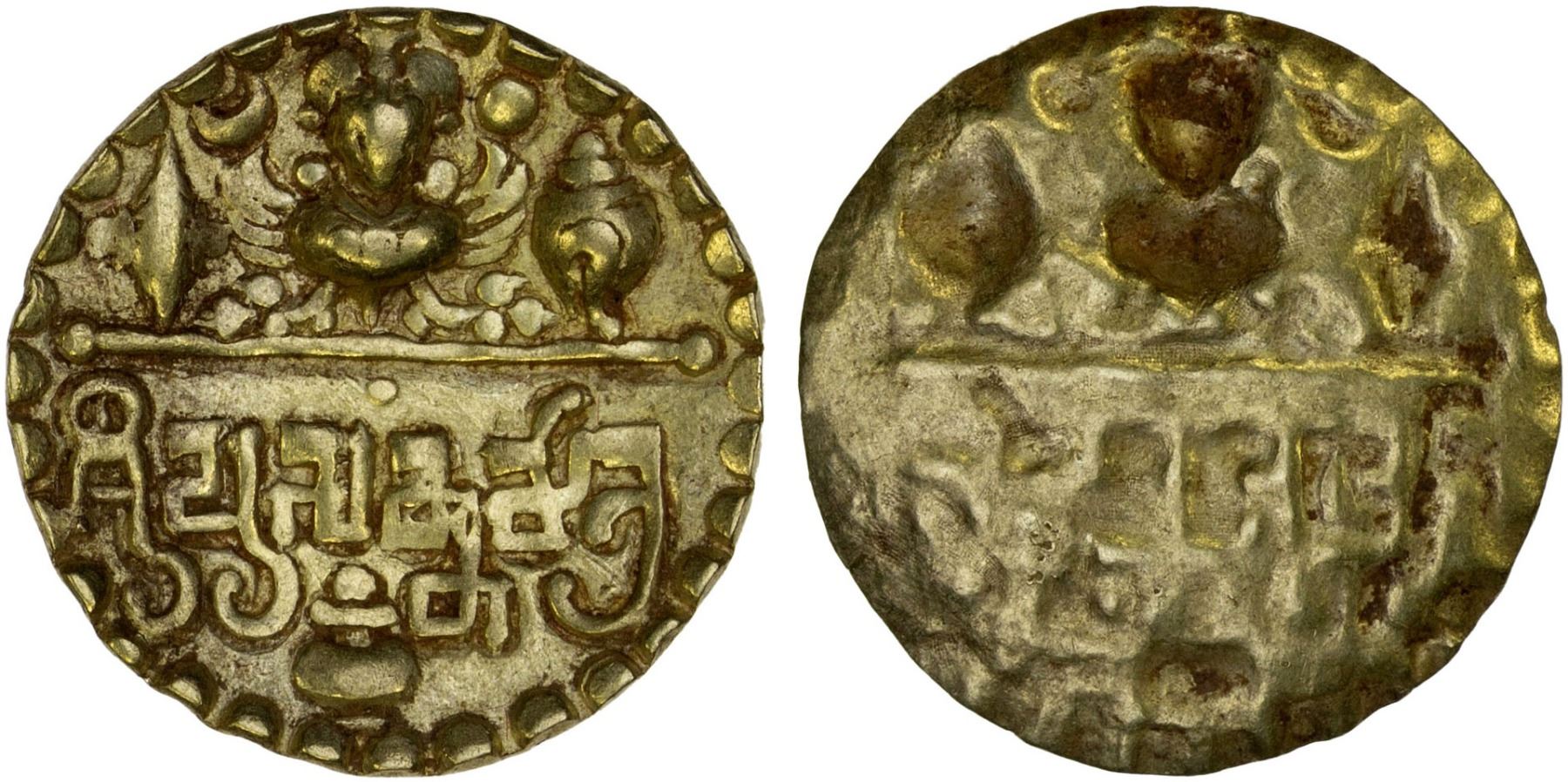 SARABHAPURIYAS OF KOSALA: Prasannamitra, ca. 550-530, AV bracteate (1.29g), cf. Pieper-3719, Garuda flanked by conch and chakra, above are sun and moon, Brahmi legend sri prasannamatra, vase (kalasa) at the bottom, XF, RR.