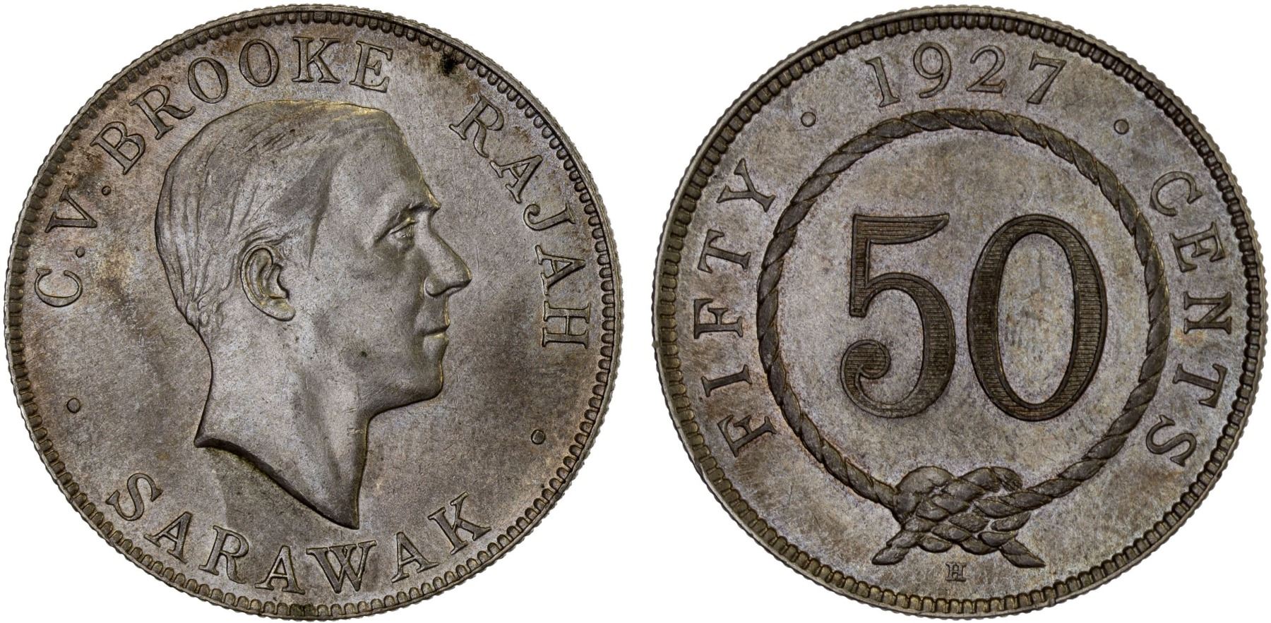SARAWAK: Charles V. Brooke, 1917-1946, AR 50 cents, 1927-H, XF-AU